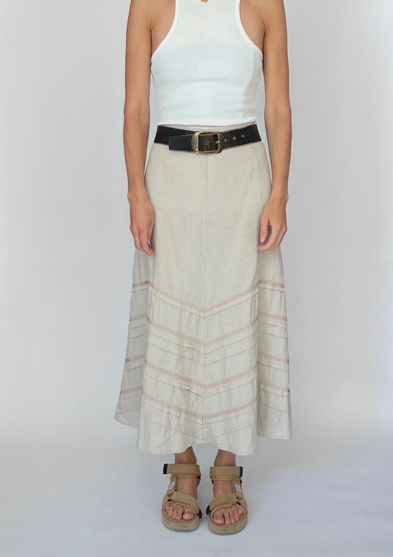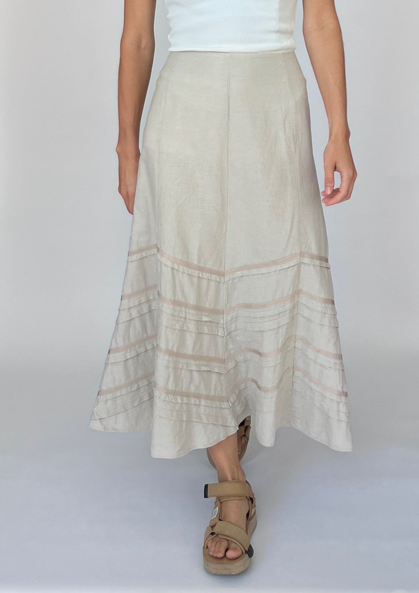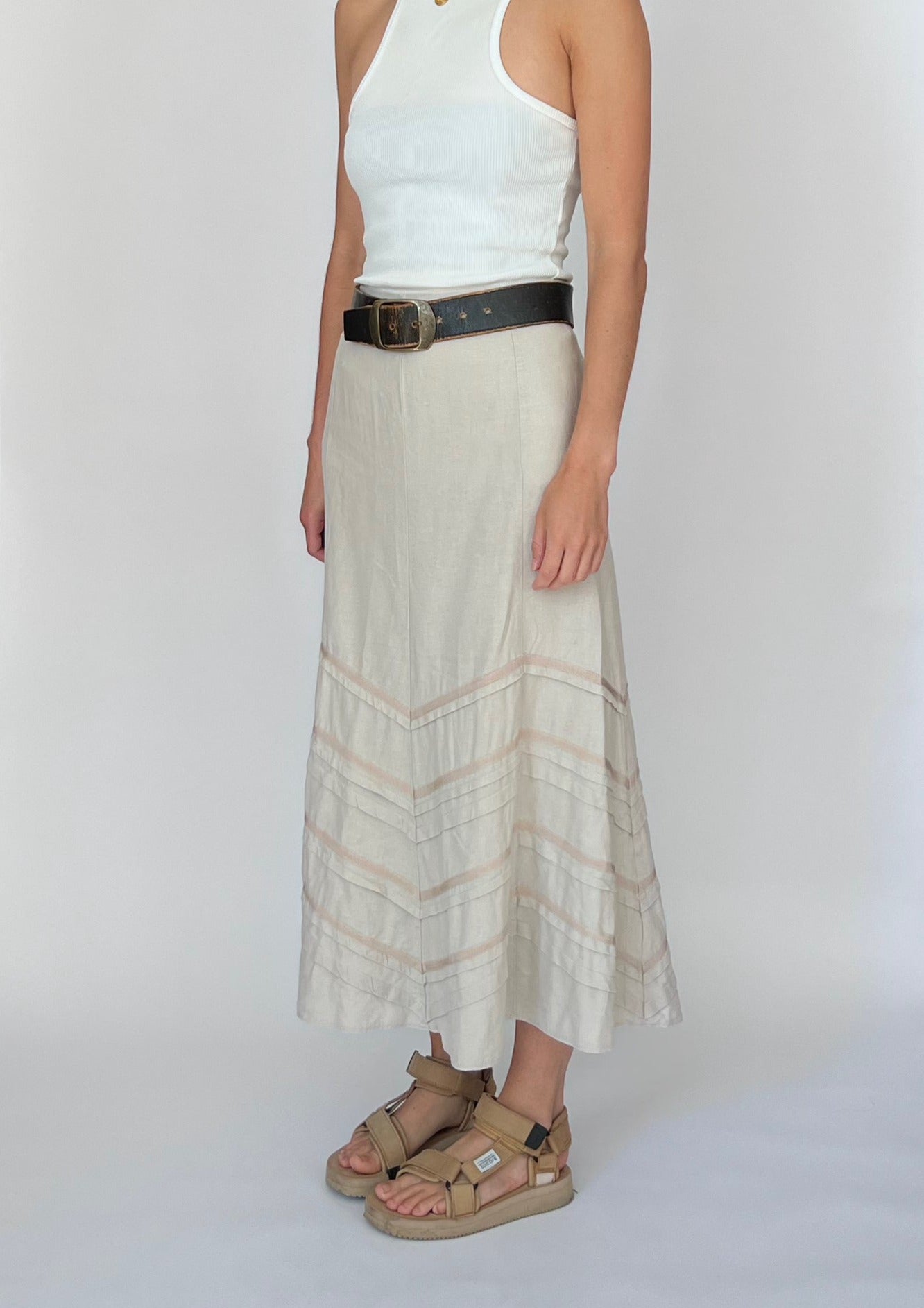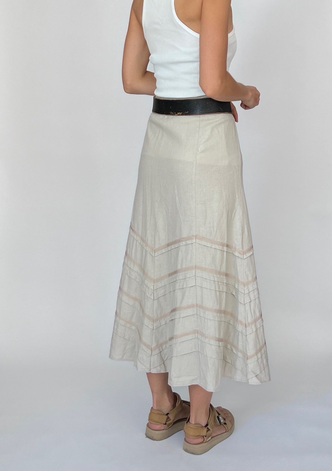 Cream 90s linen midi skirt. Features a flat waist, A-Line skirt and asymmetric pleat details. Fasten with an invisible side zip