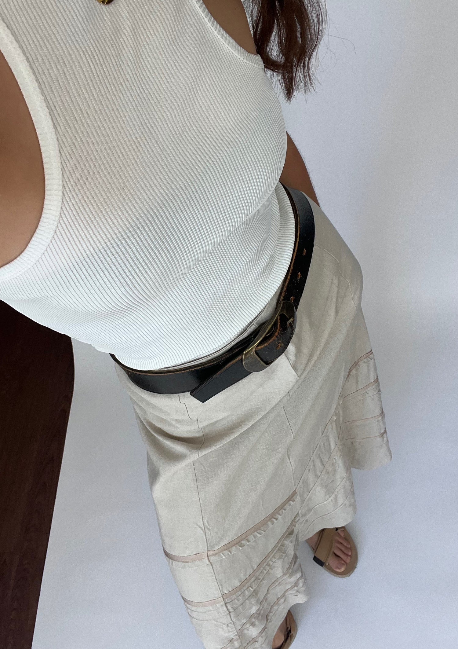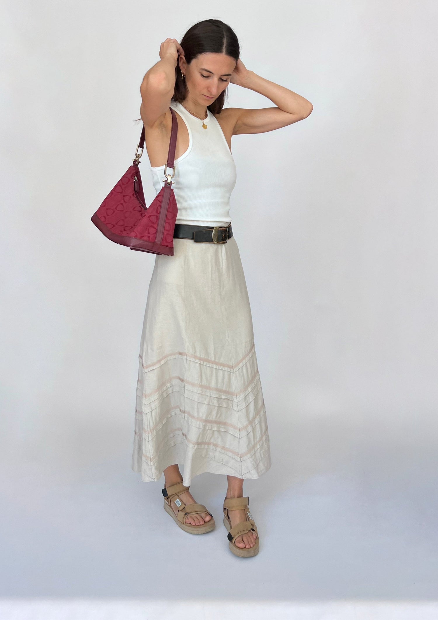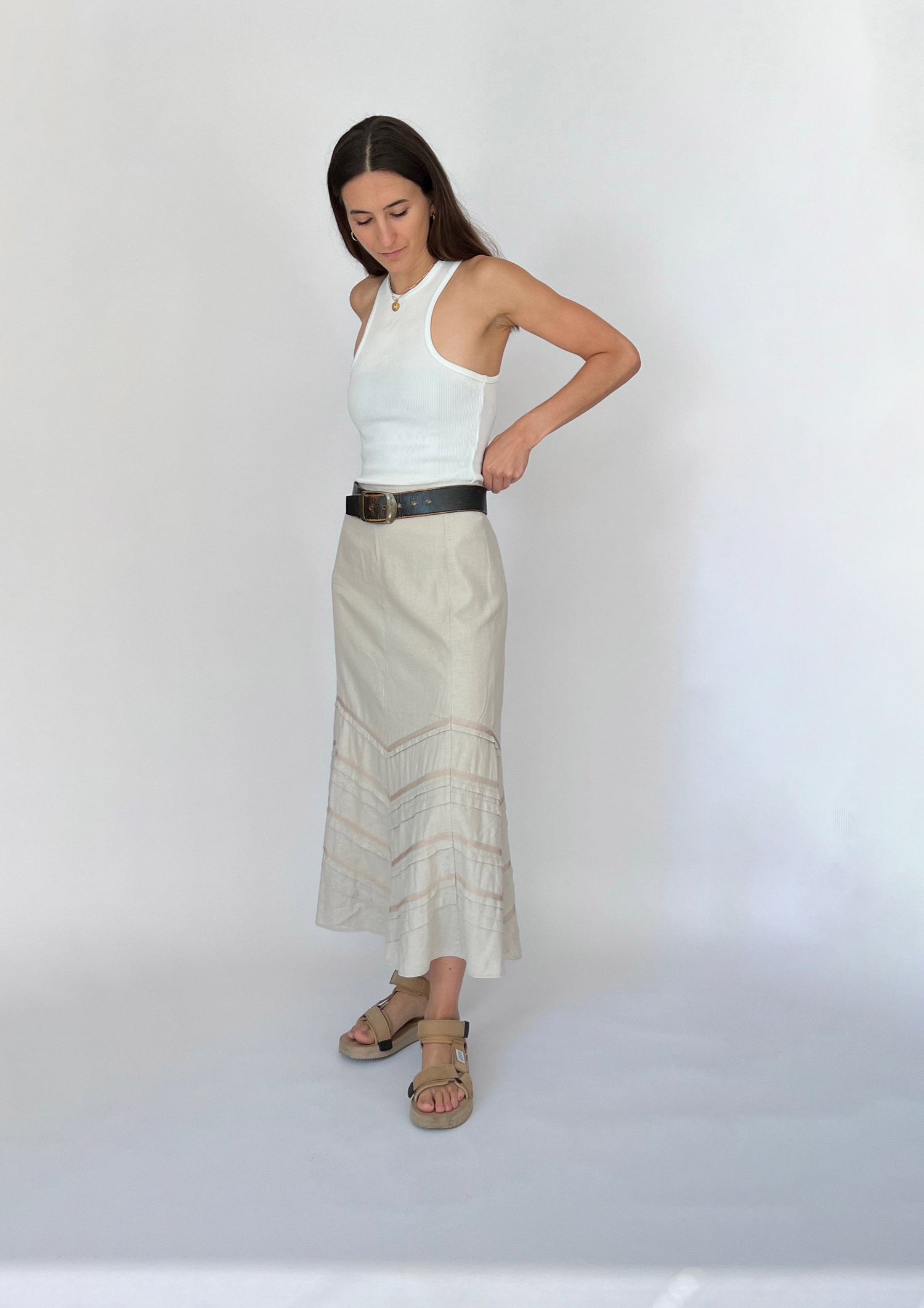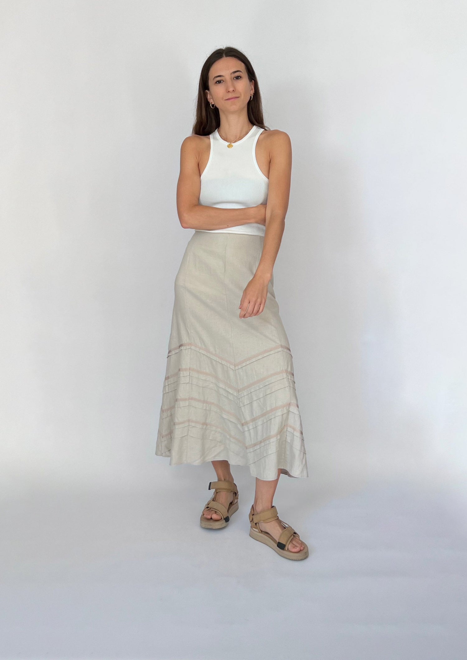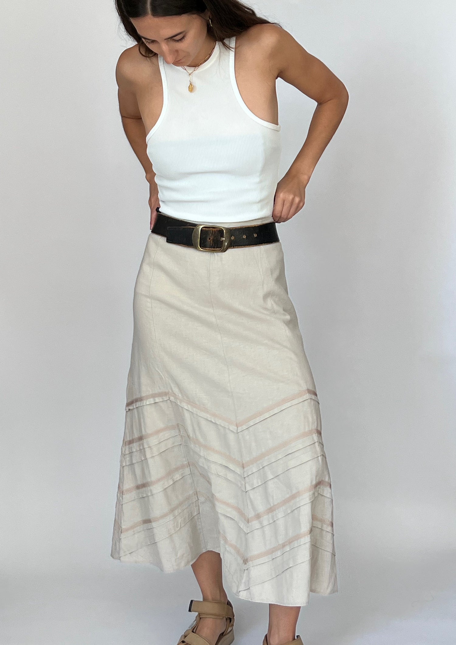 Cream 90s linen midi skirt. Features a flat waist, A-Line skirt and asymmetric pleat details. Fasten with an invisible side zip