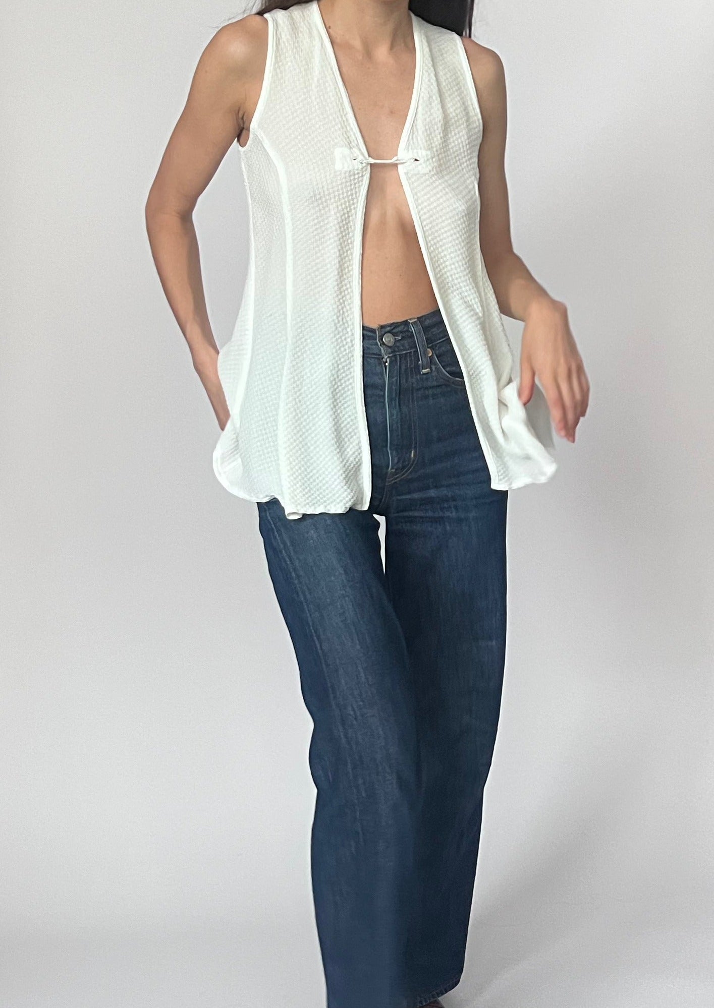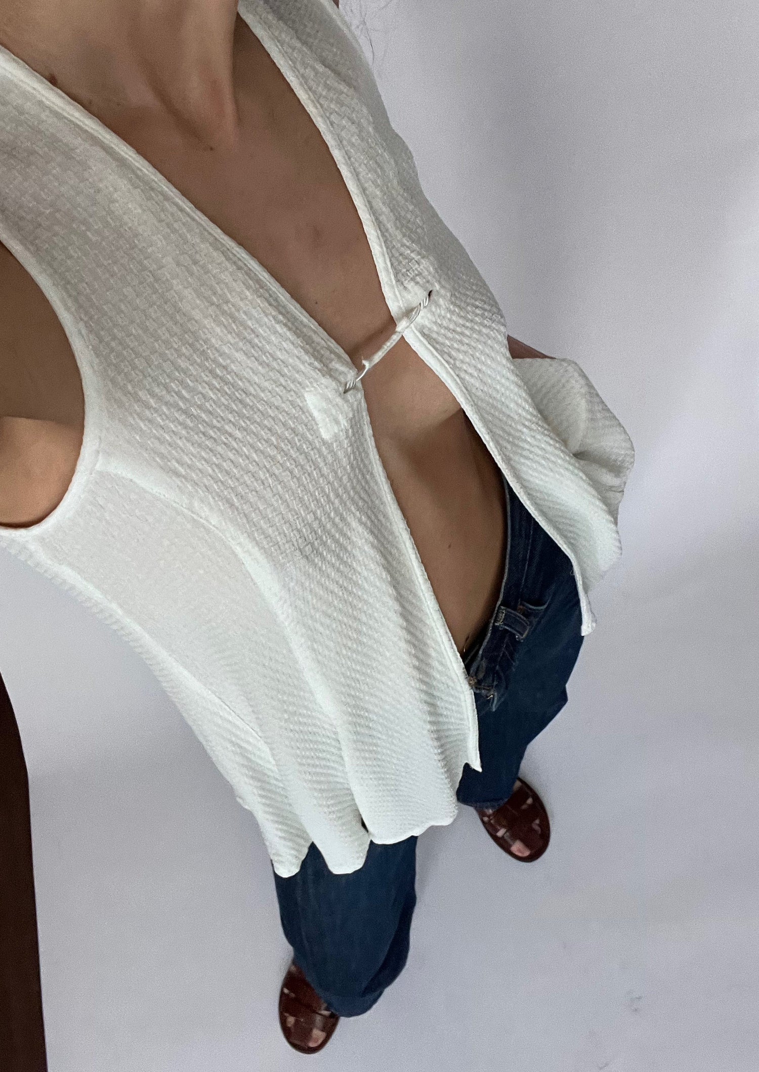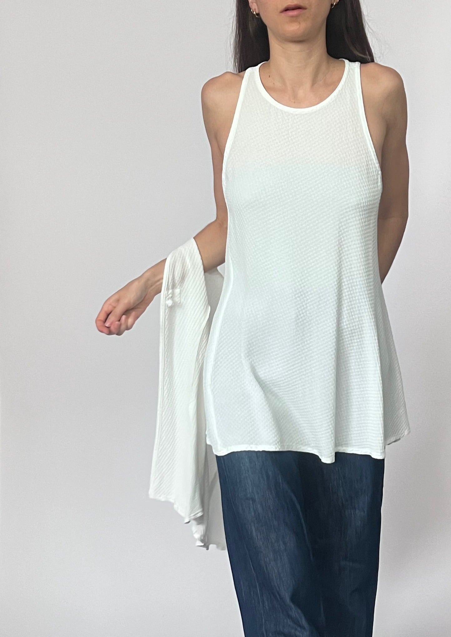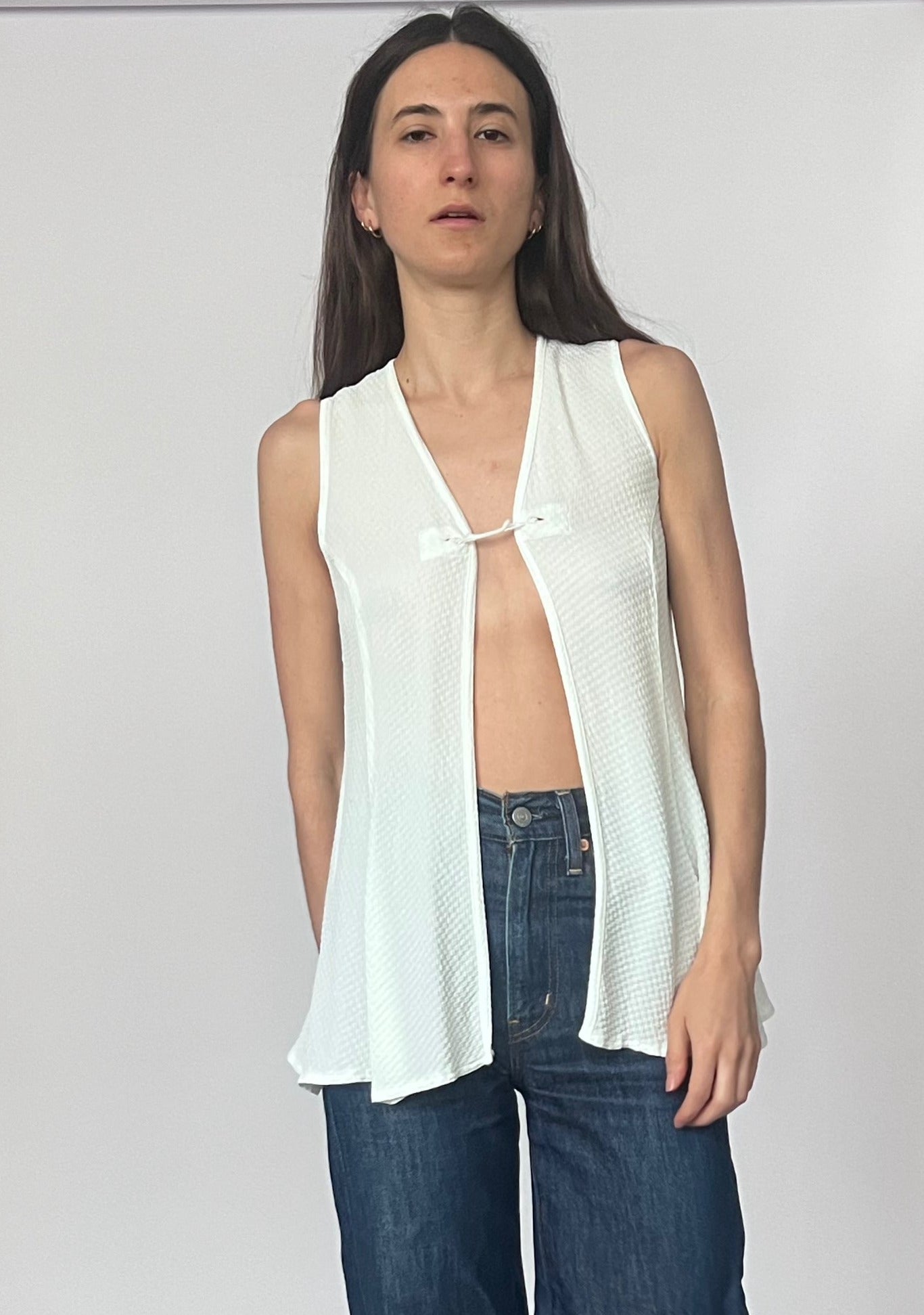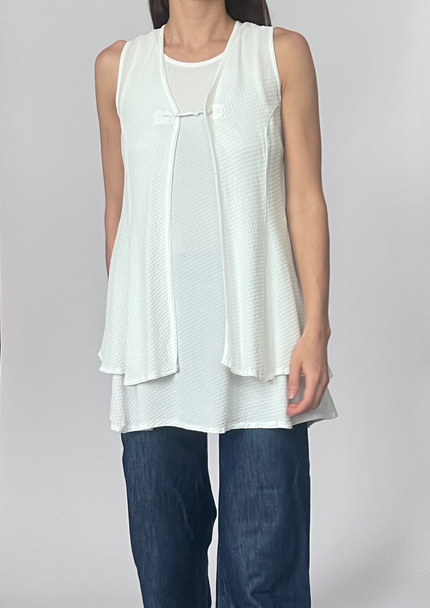 An Armani textured tank and waistcoat set. Style together or separately. Features a longline racer style tank, and open front waistcoat.