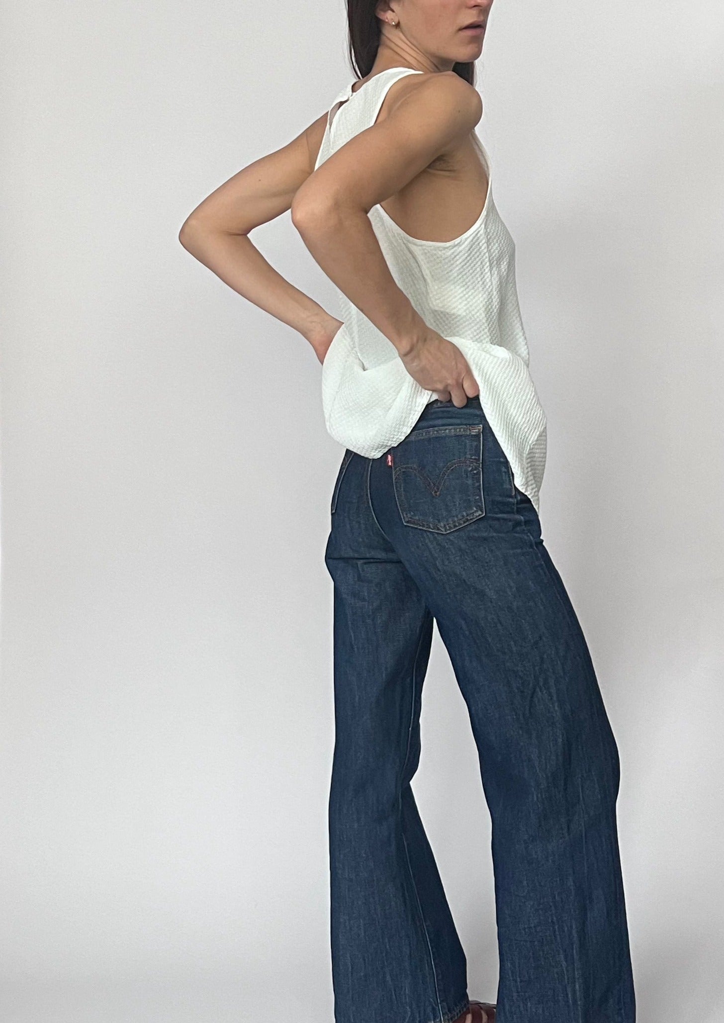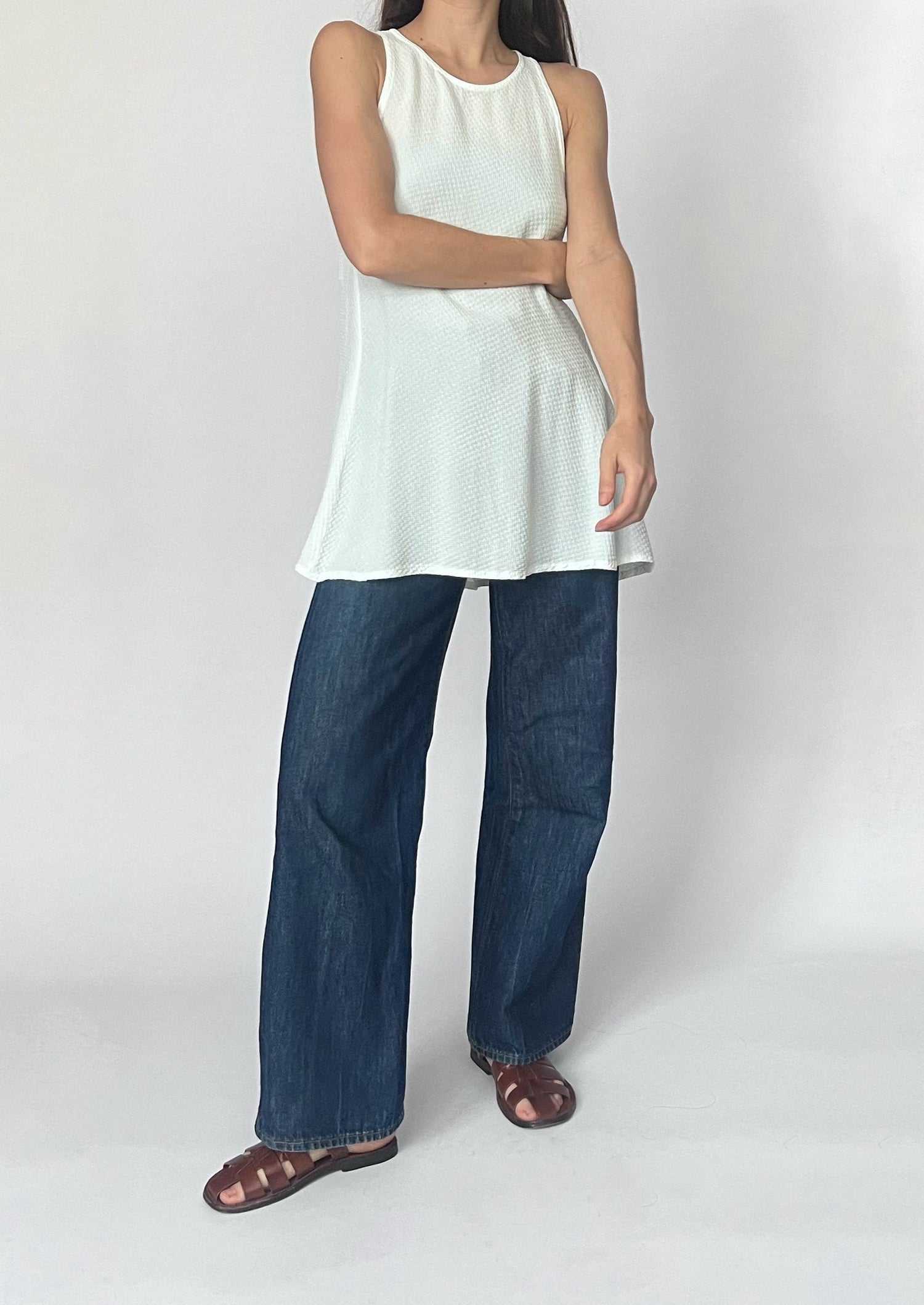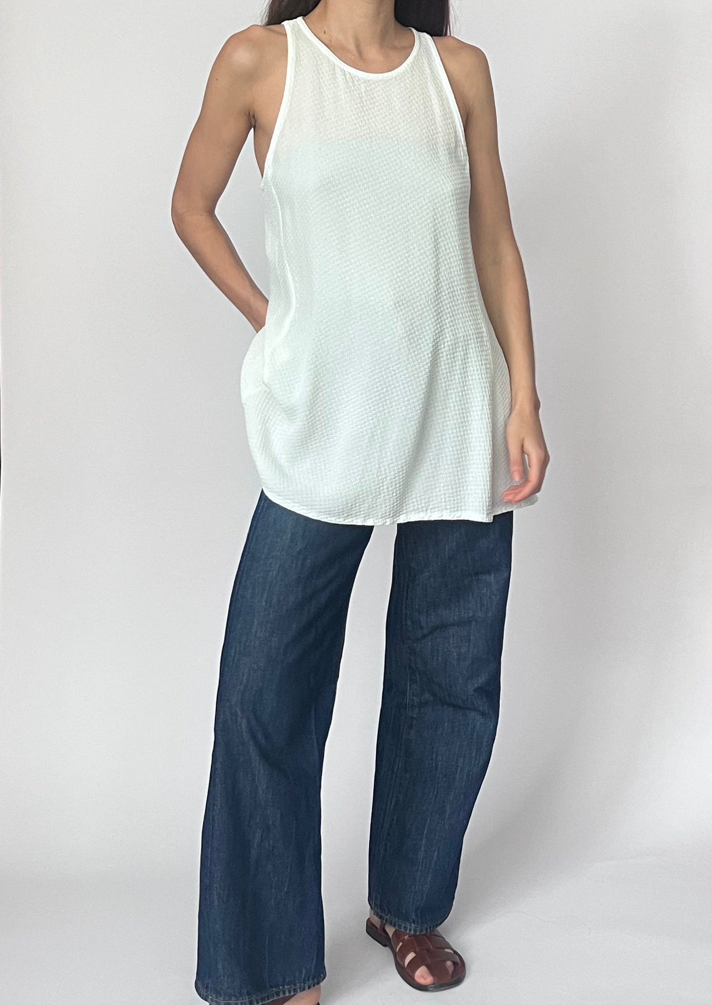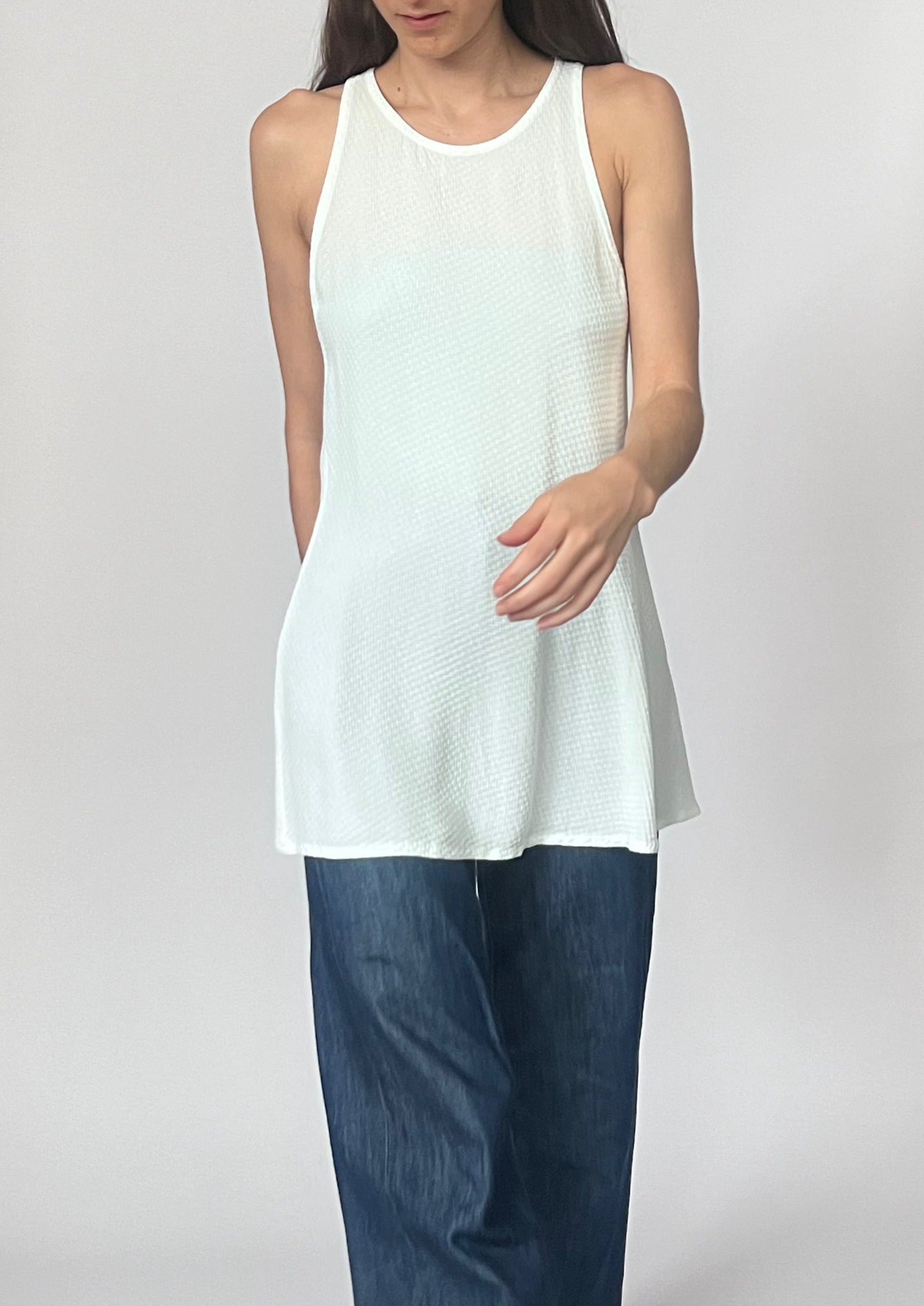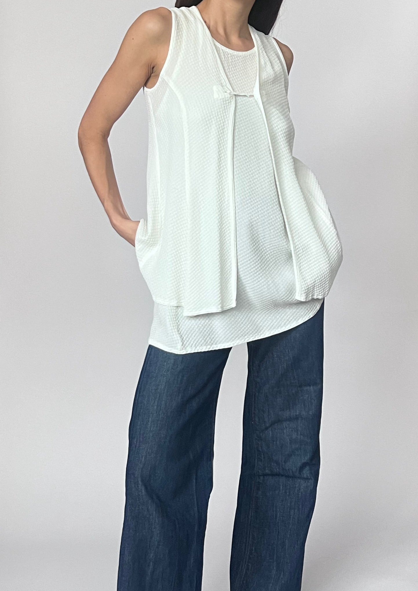 An Armani textured tank and waistcoat set. Style together or separately. Features a longline racer style tank, and open front waistcoat.