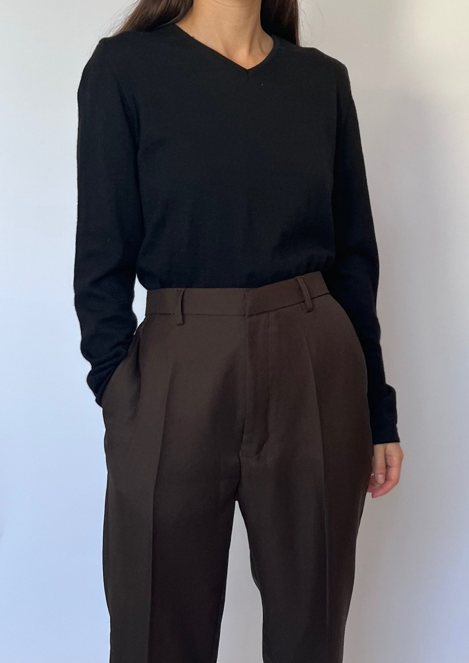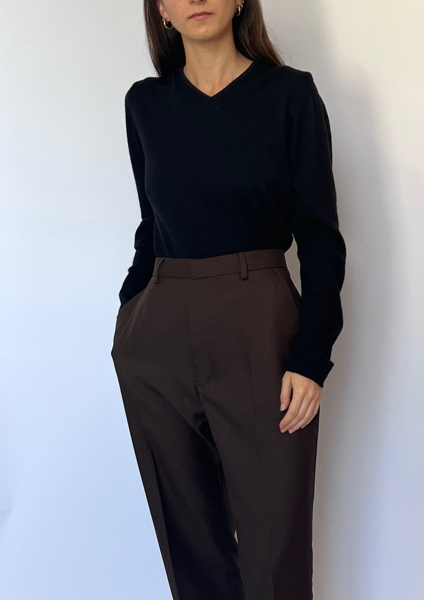 Fitted vintage merino wool jumper. Made by 'Antonella' in Italy. Made in 100% Merino Wool. In a cropped length, features a long sleeve, v-neck and long sleeves.