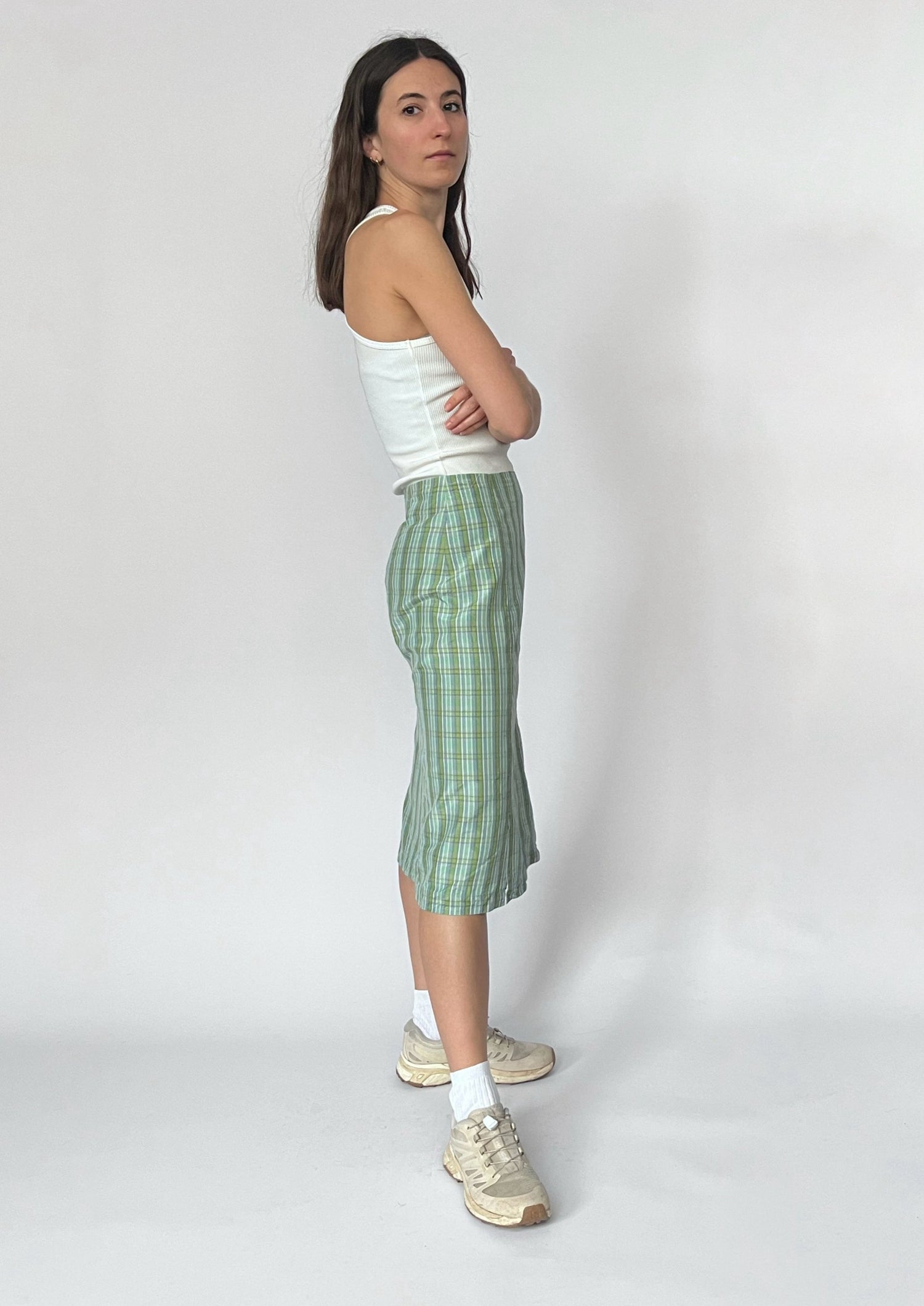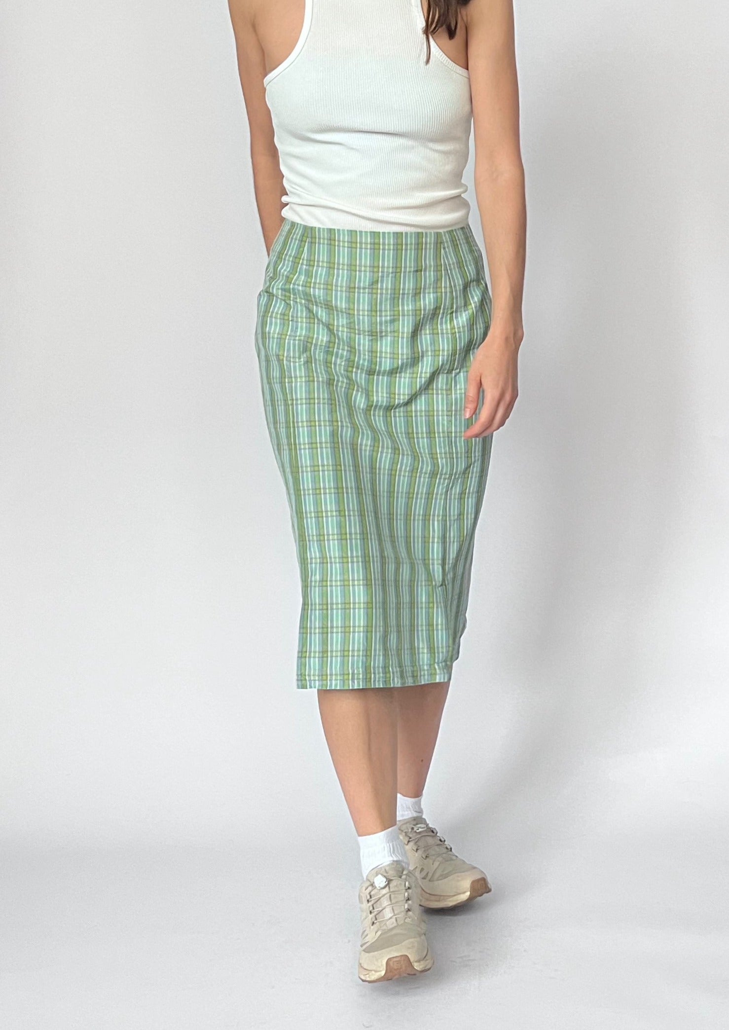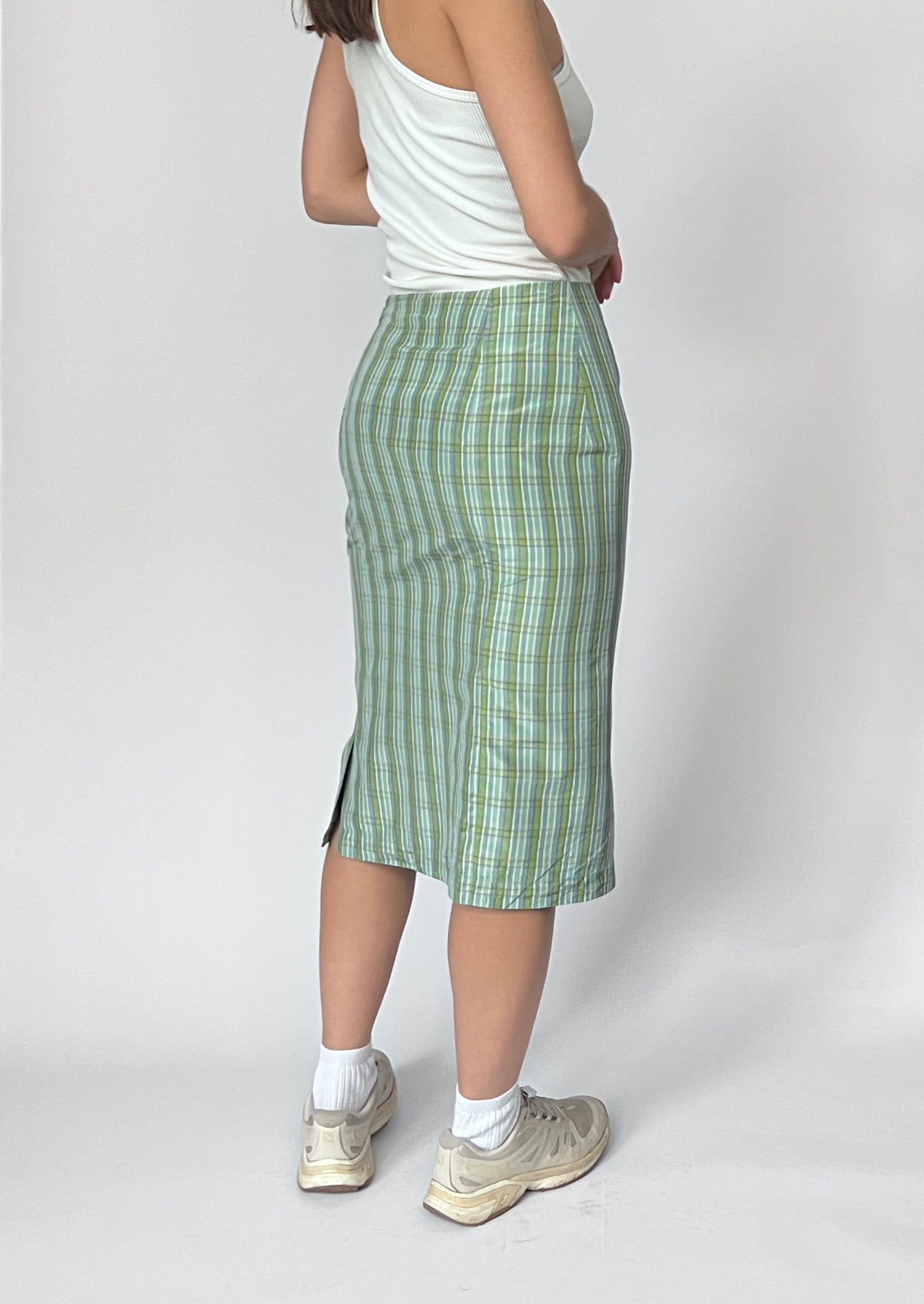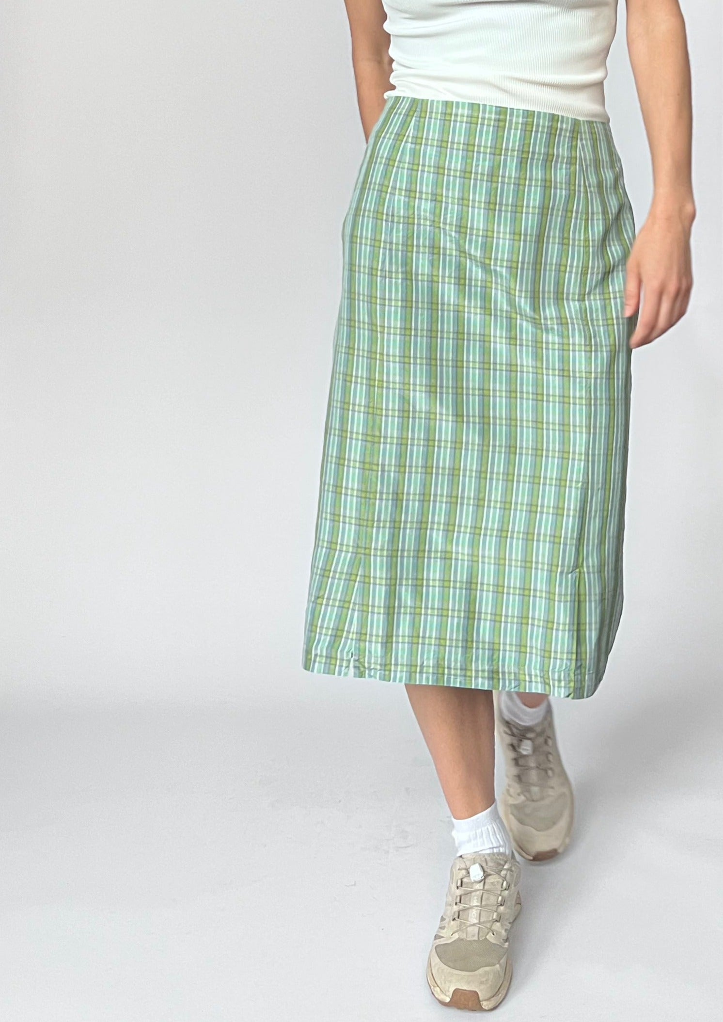 A green/blue checked silk skirt from the 90s. Features three splits at the hem, side zip to fasten and midi length. Style with a relaxed t-shirt and trainers.