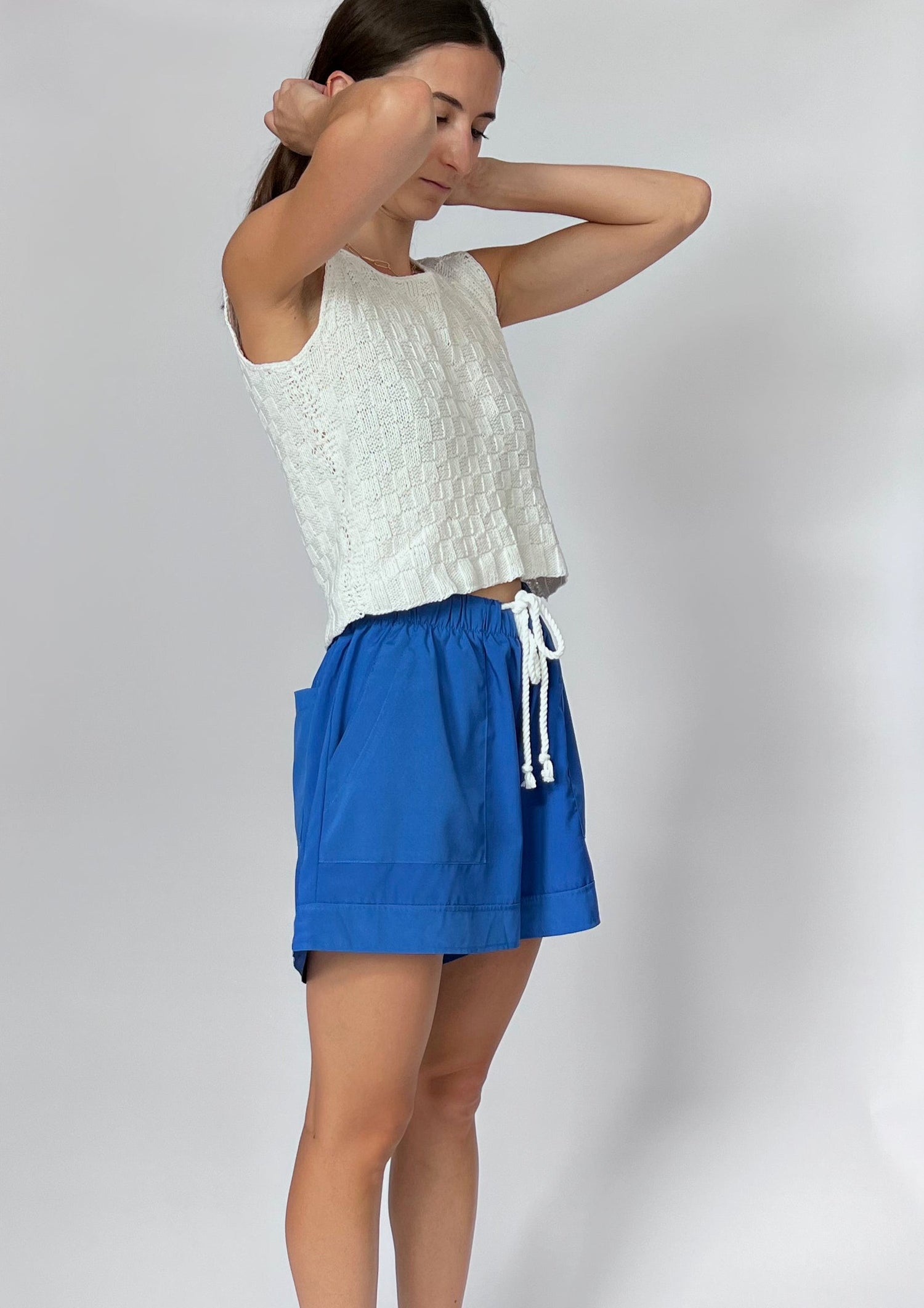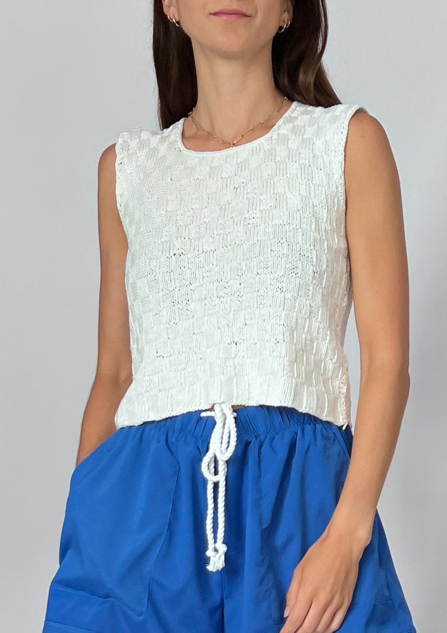 90s white knitted tank/vest. Features a high neck, hip length and relaxed shape. Believed to be handknitted in cotton