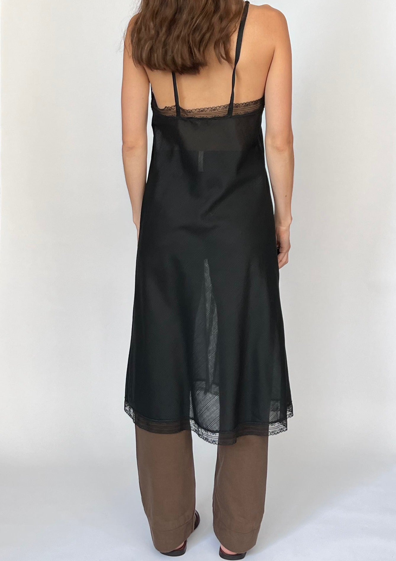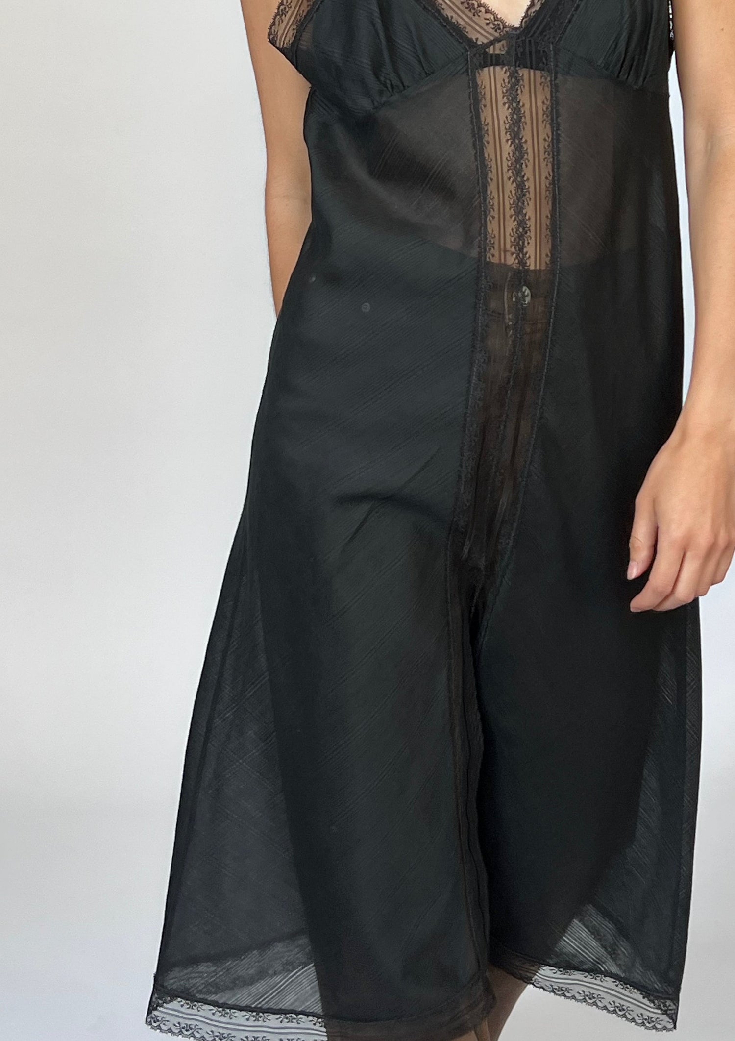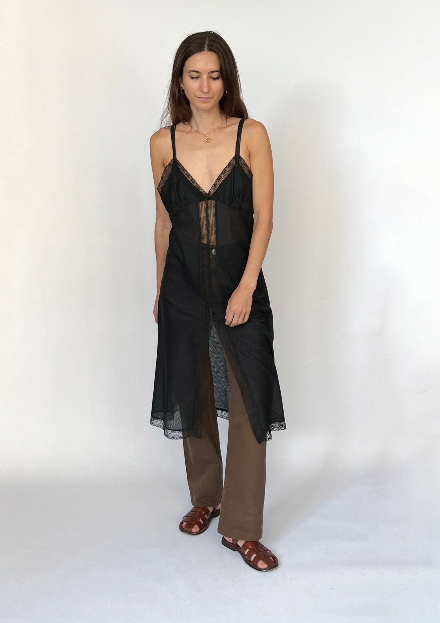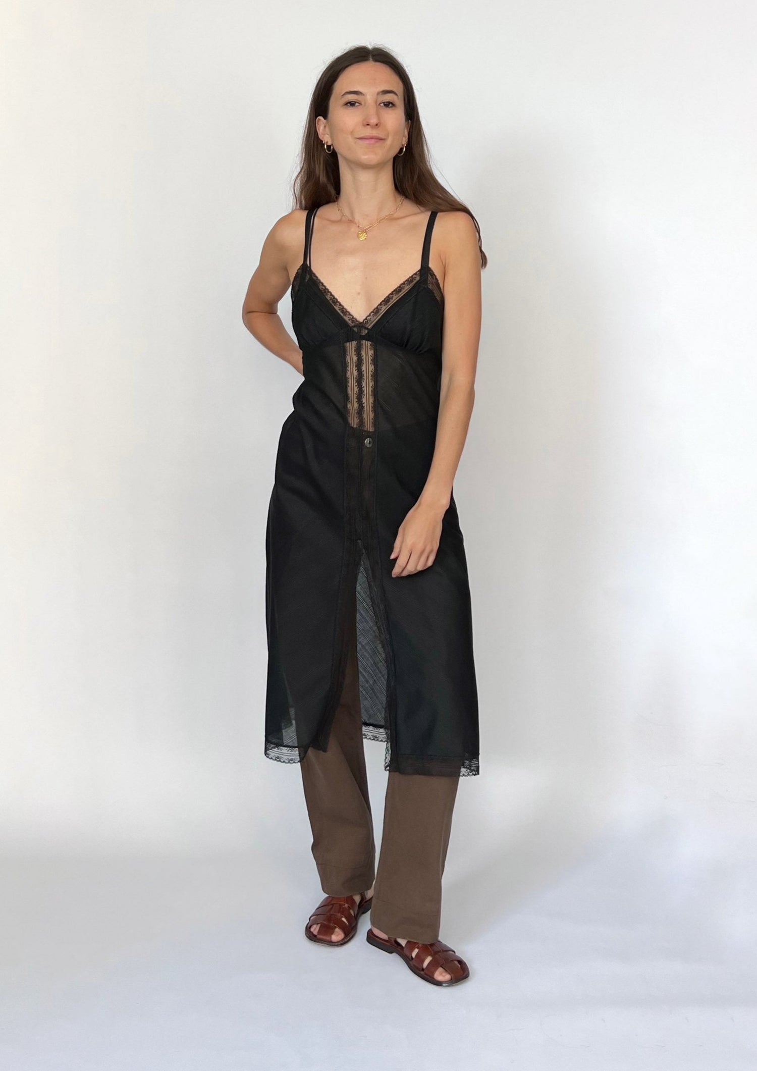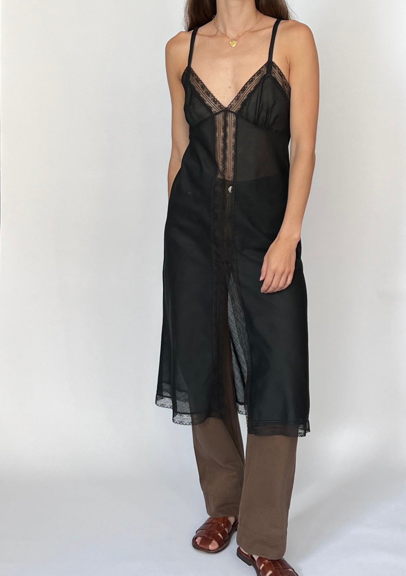 90s Sheer lace slip dress. Features a lace trim to neck, hem and centre, A split at the front which makes it perfect to wear over trousers!