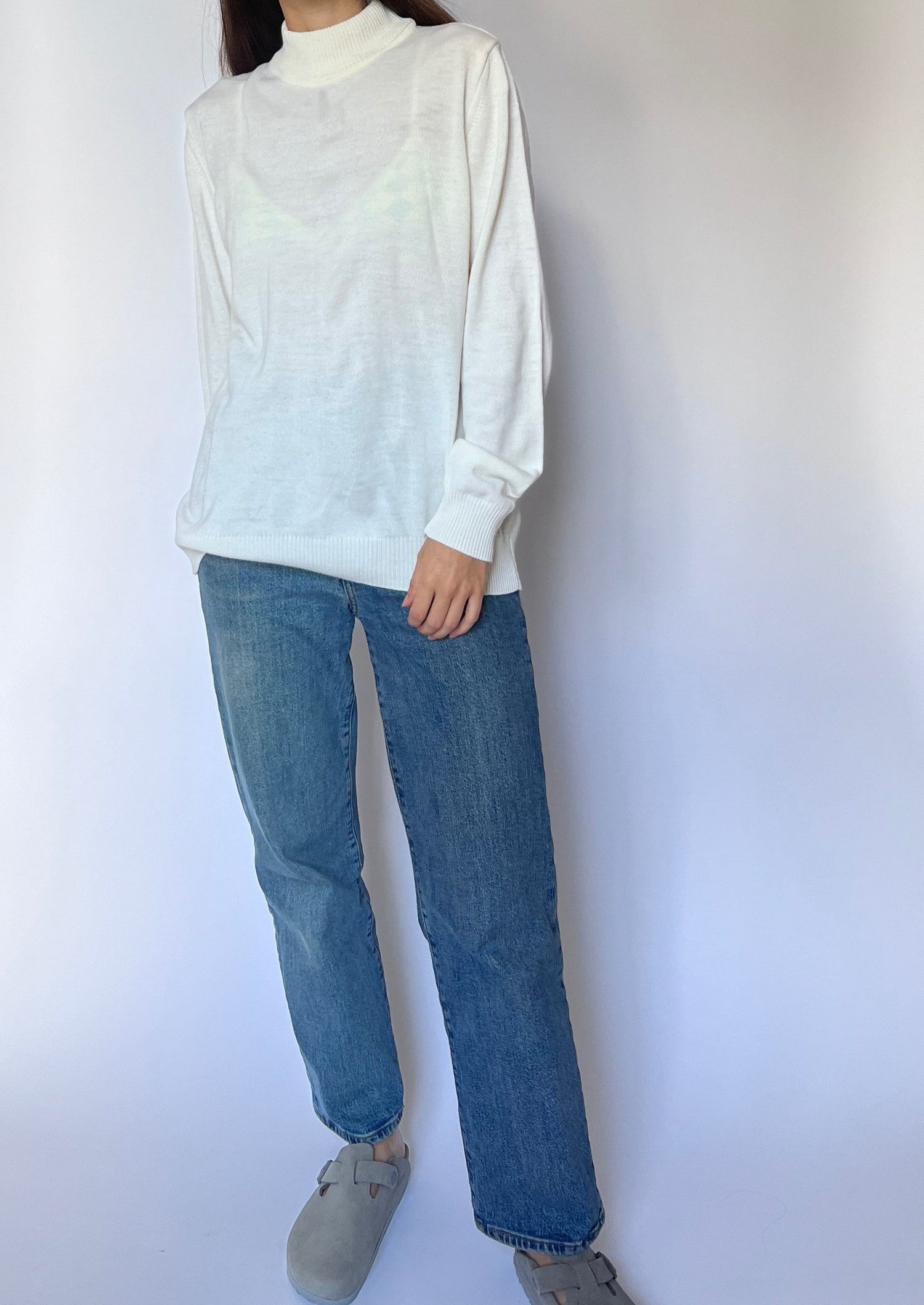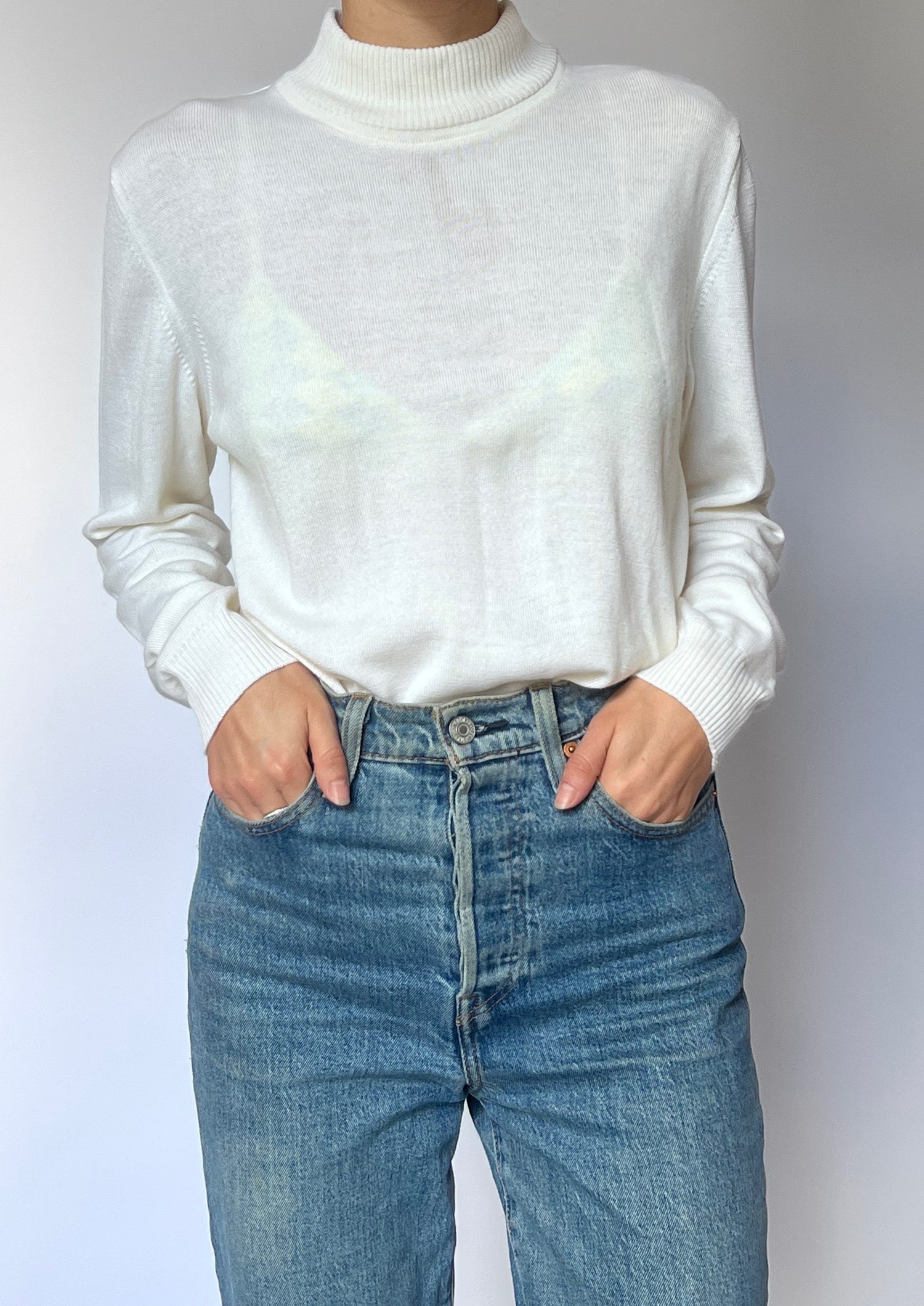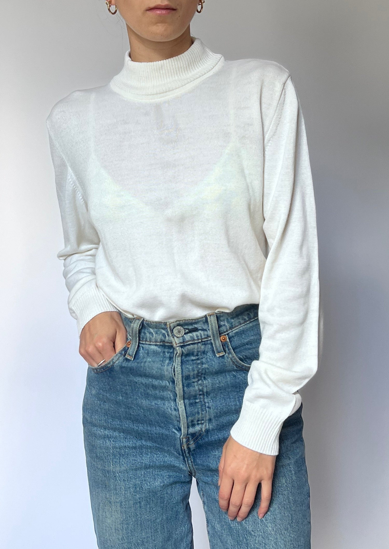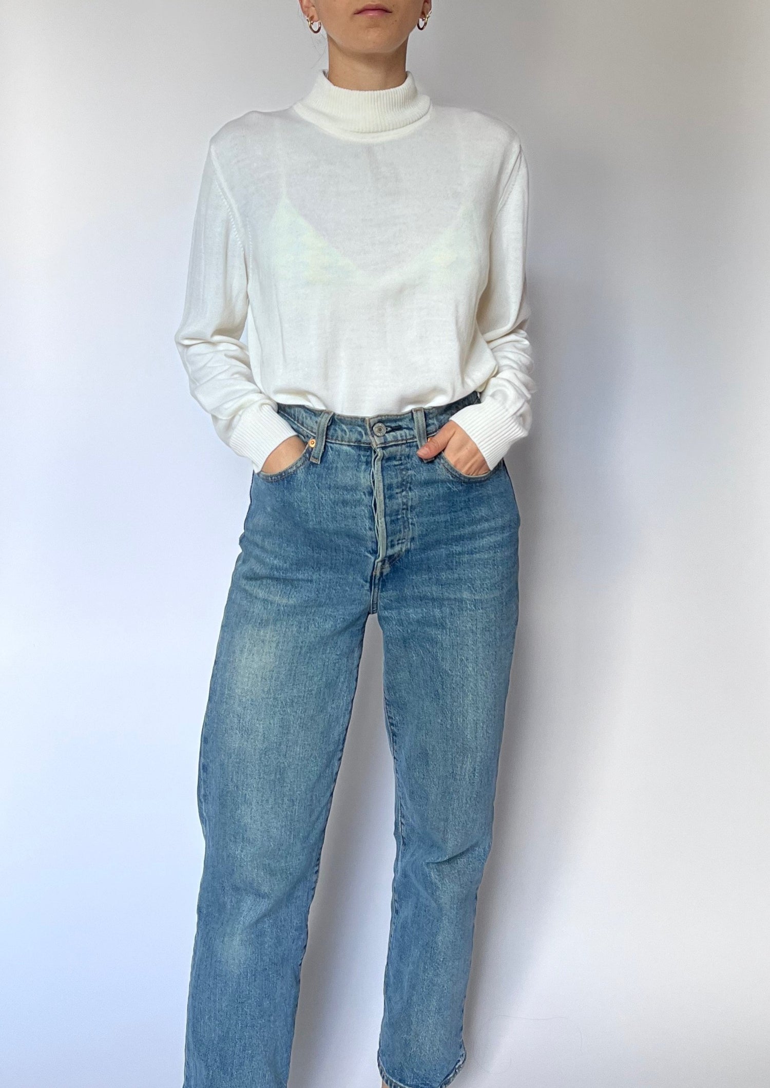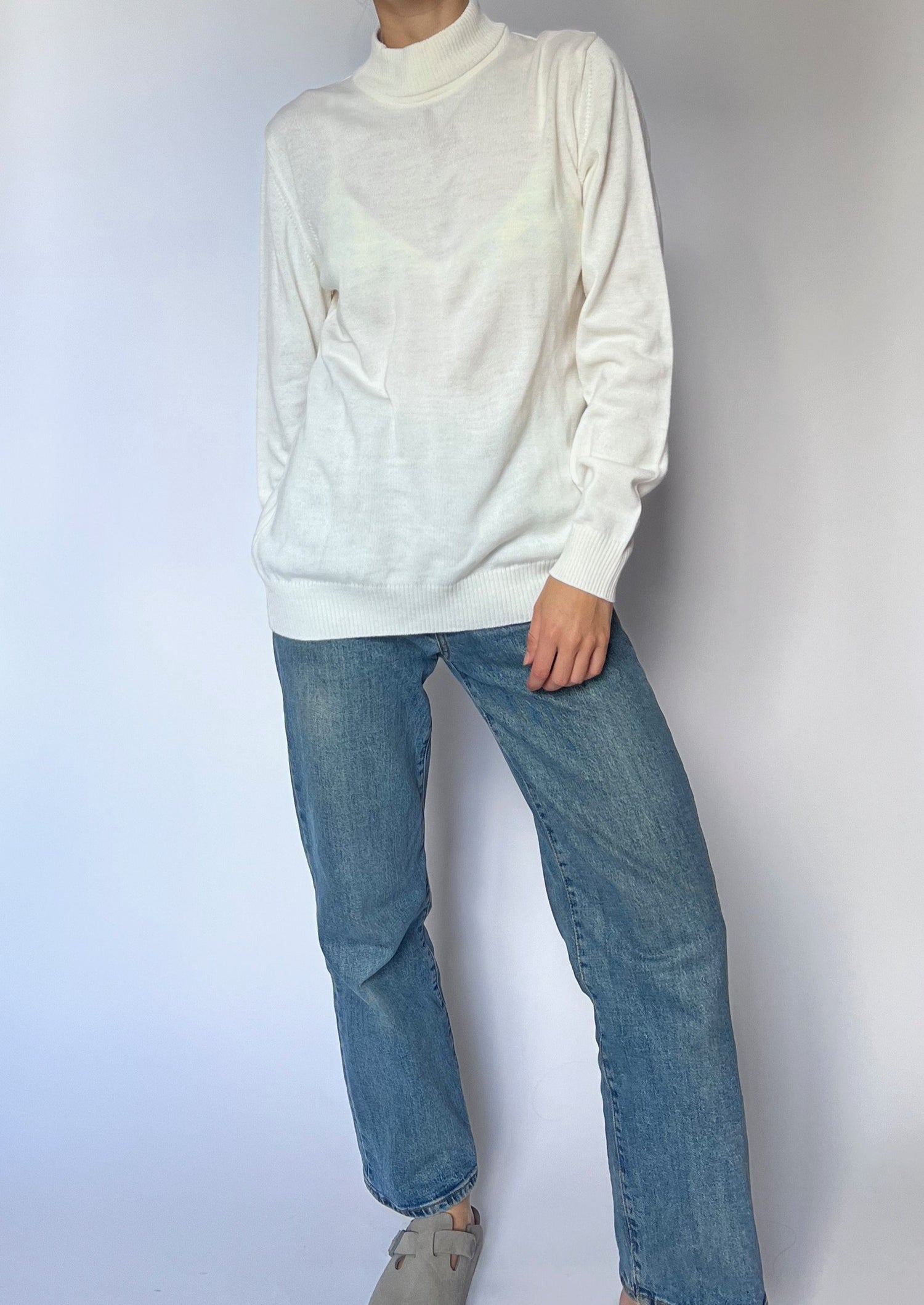 White jumper in Merino Wool. Made by 'Adagio'. Featuring a ribbed high neck, long sleeves and a relaxed shape.