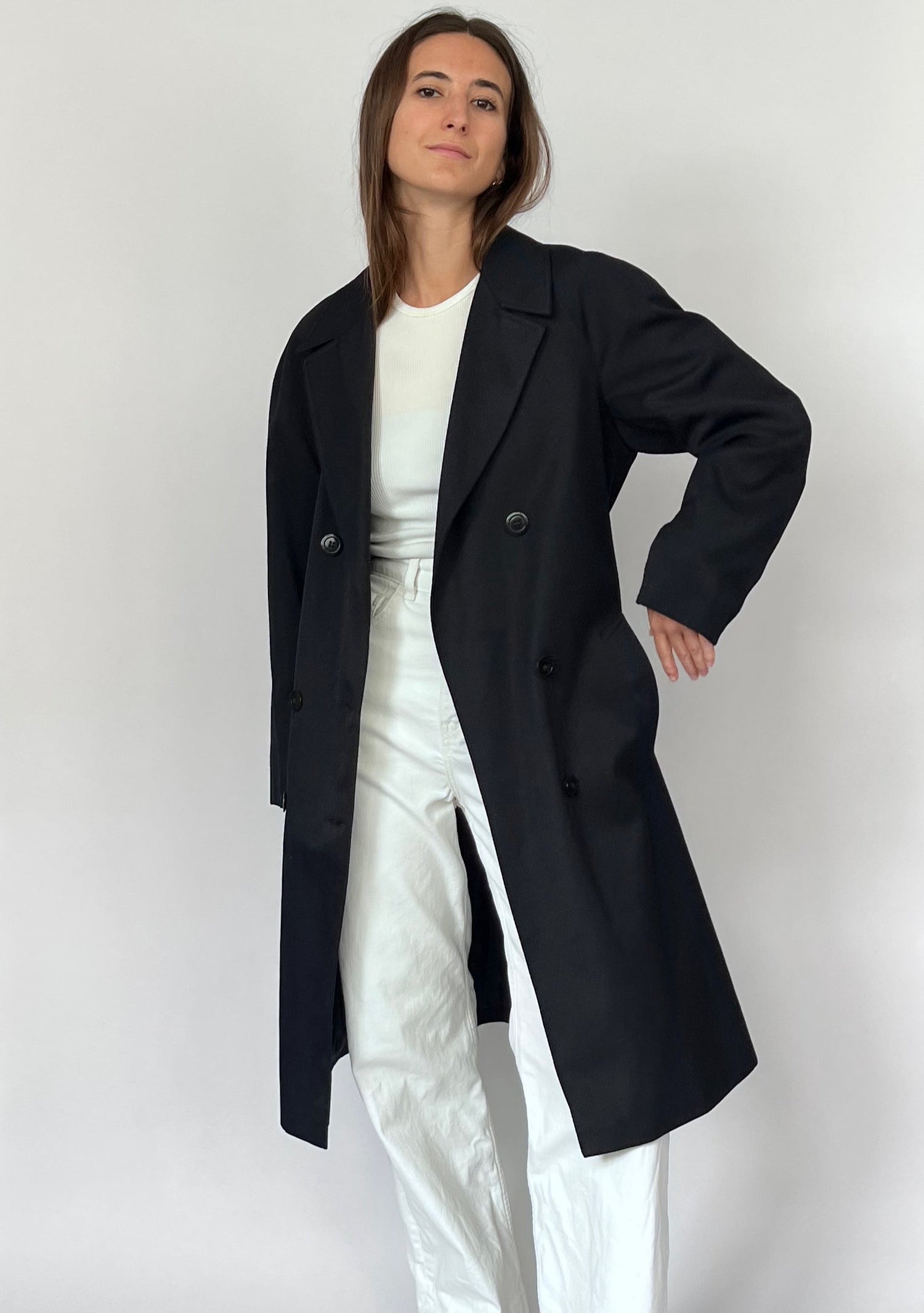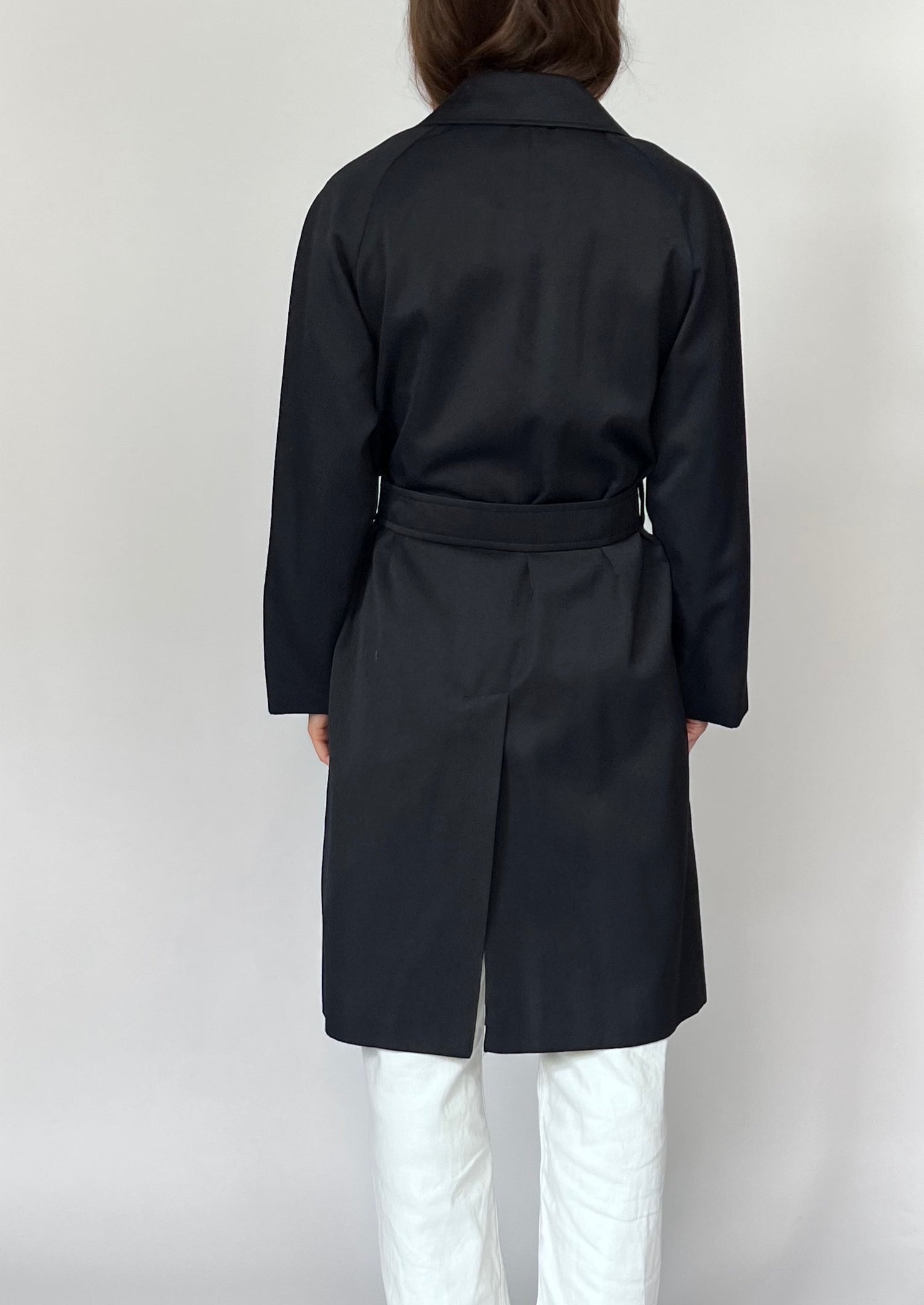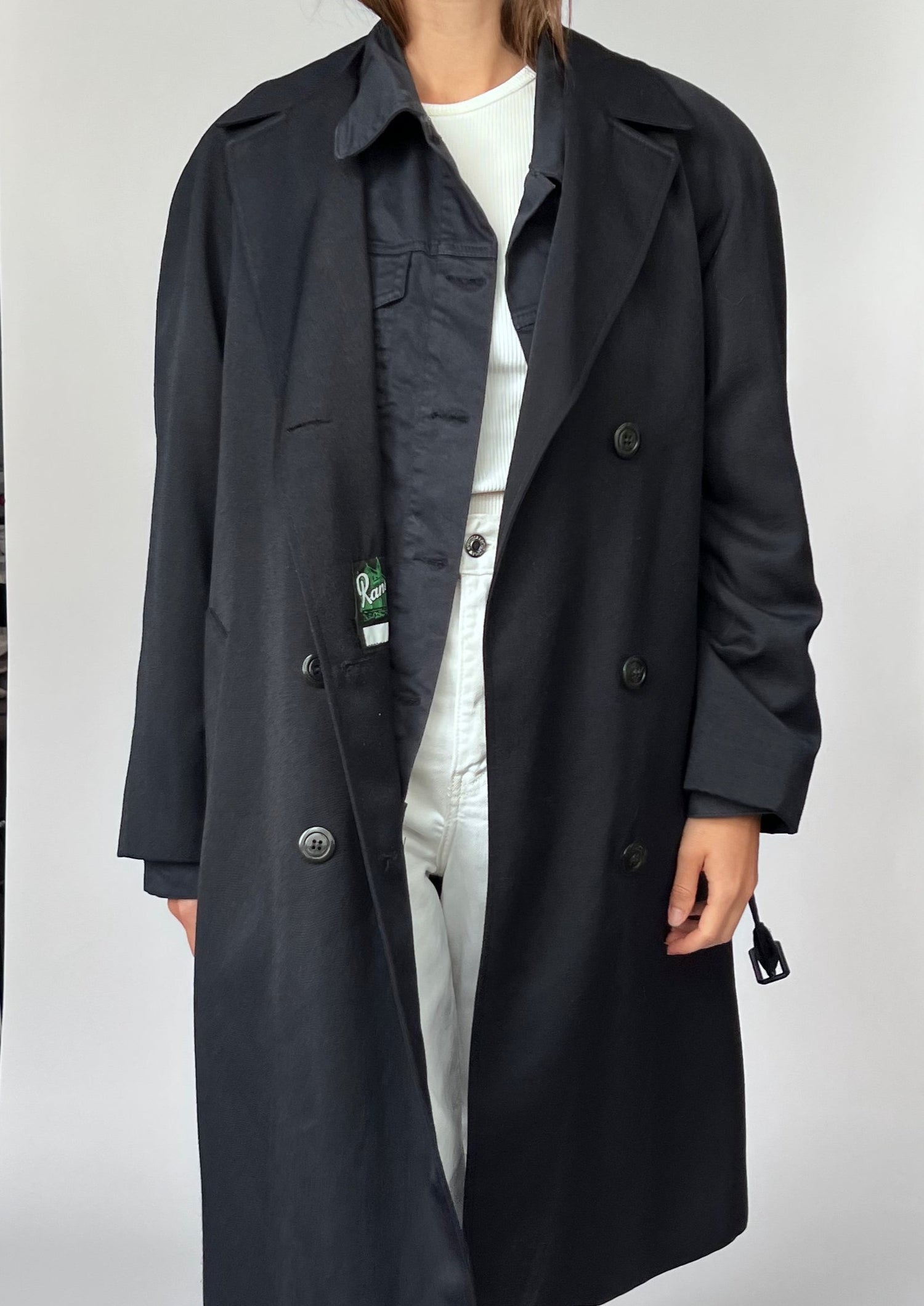 60s Navy trench coat made by Ramsome Clothing. Features two side pockets, a clean cut and a button fastening. Fully lined, a raglan sleeve and fastened with a belt.