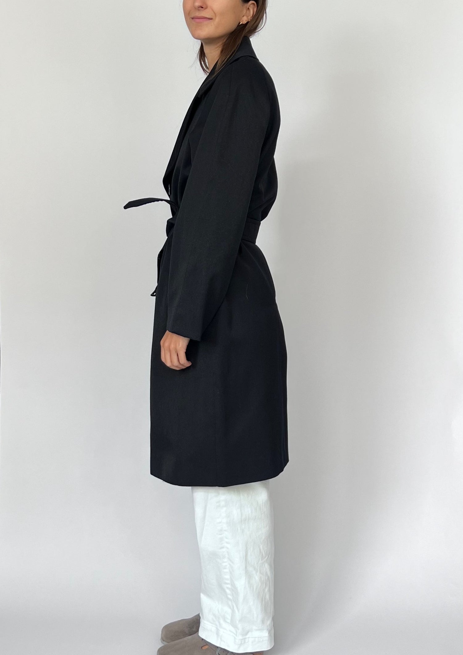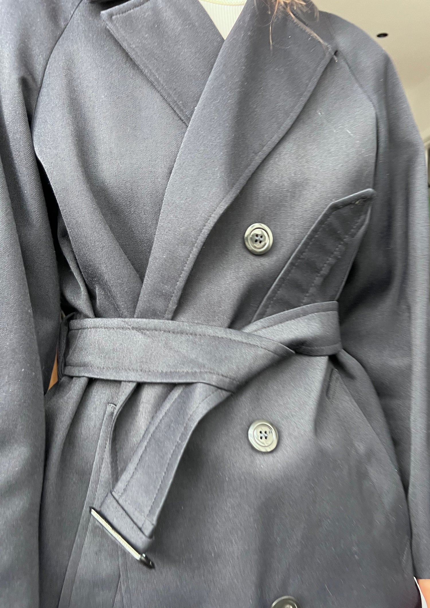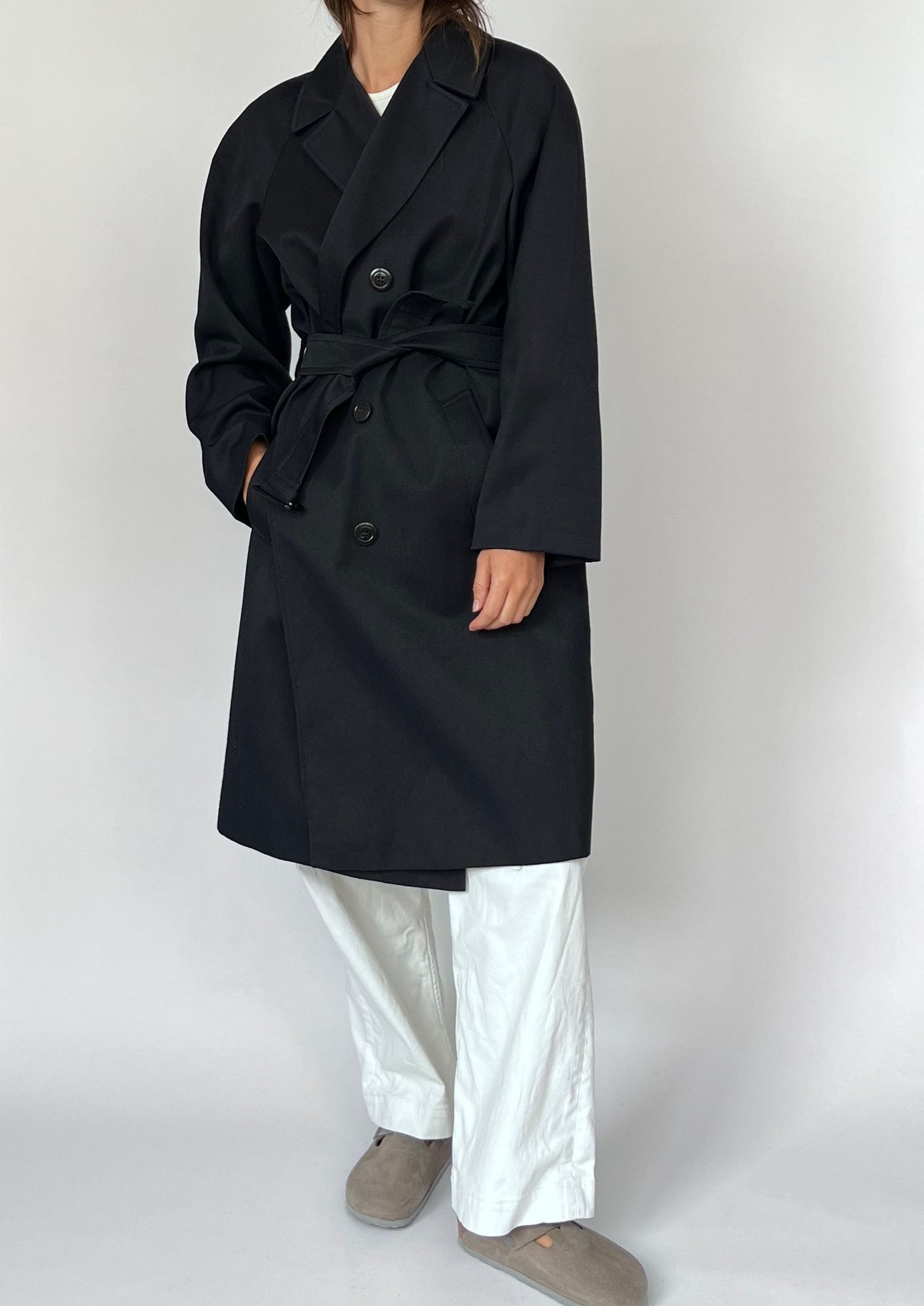 60s Navy trench coat made by Ramsome Clothing. Features two side pockets, a clean cut and a button fastening. Fully lined, a raglan sleeve and fastened with a belt.