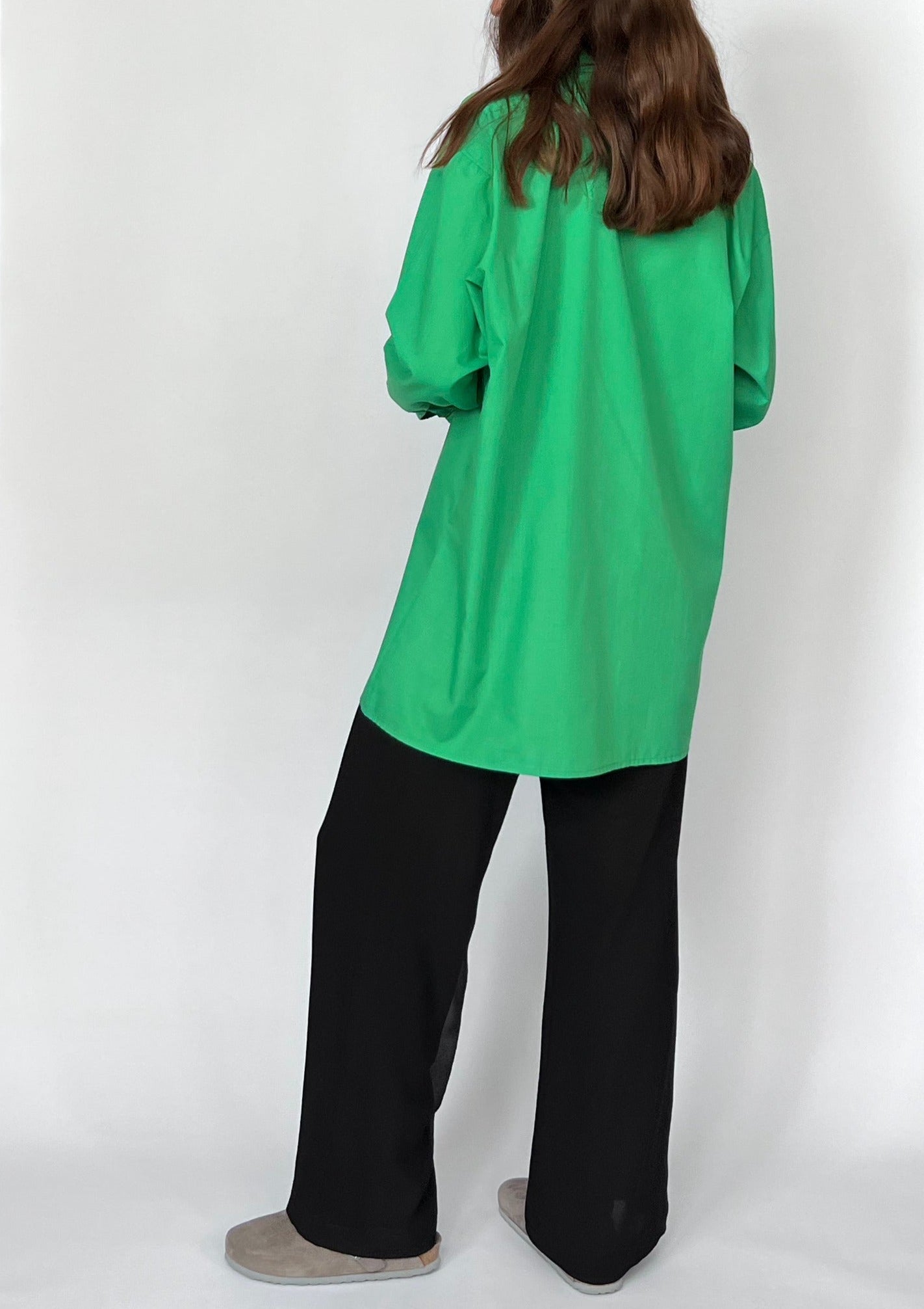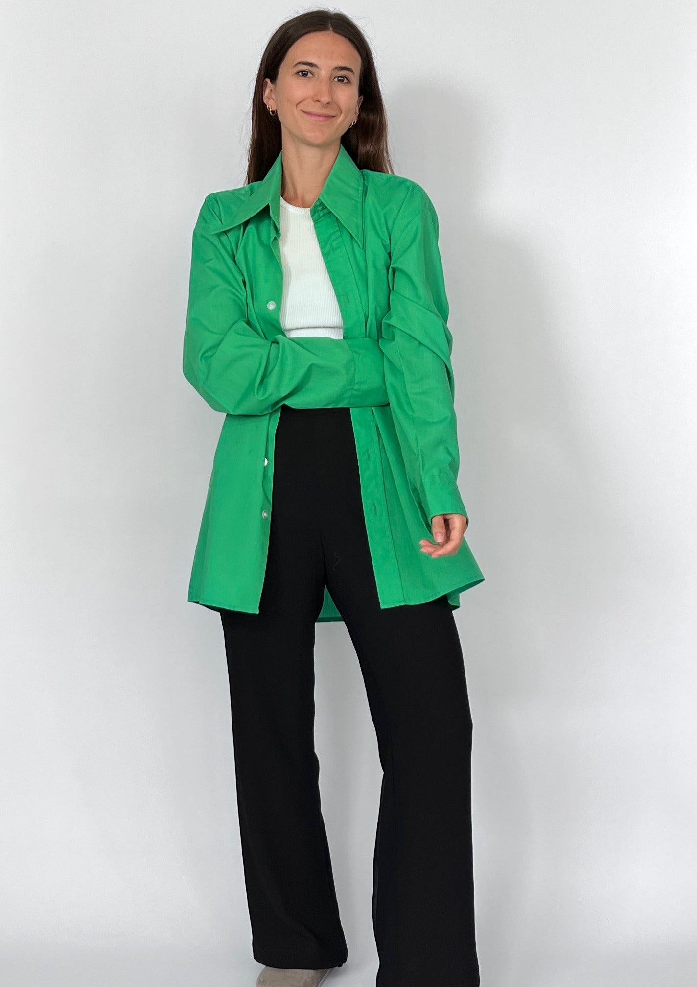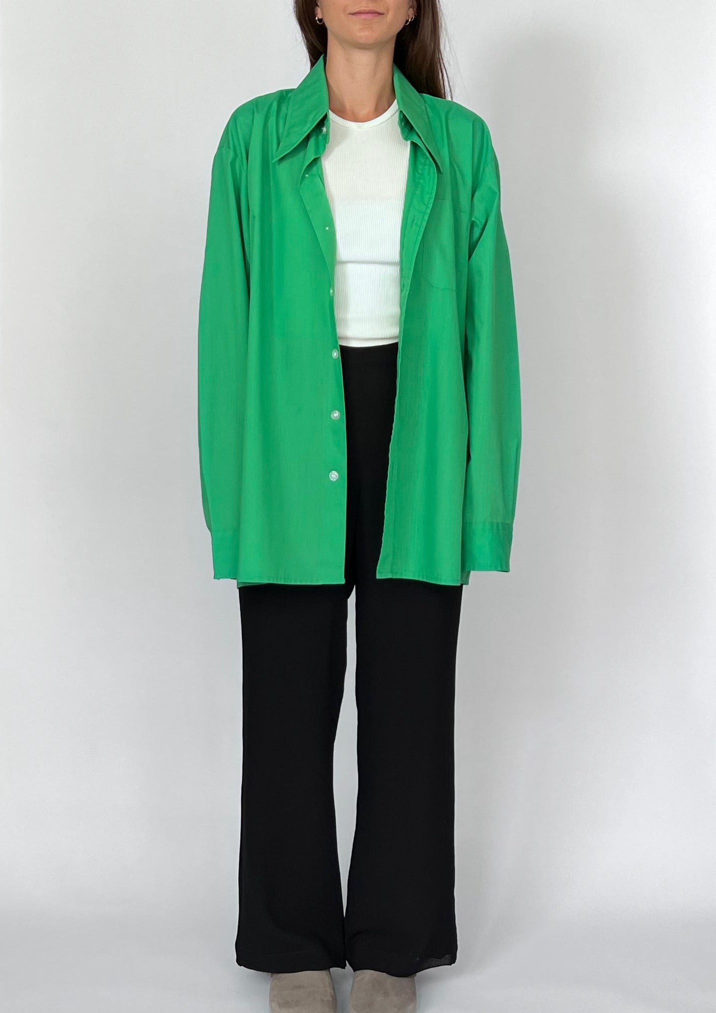 90s oversized, relaxed green shirt. Features a drop shoulder, oversized sleeves, longline length and a 70s style pointed collar.