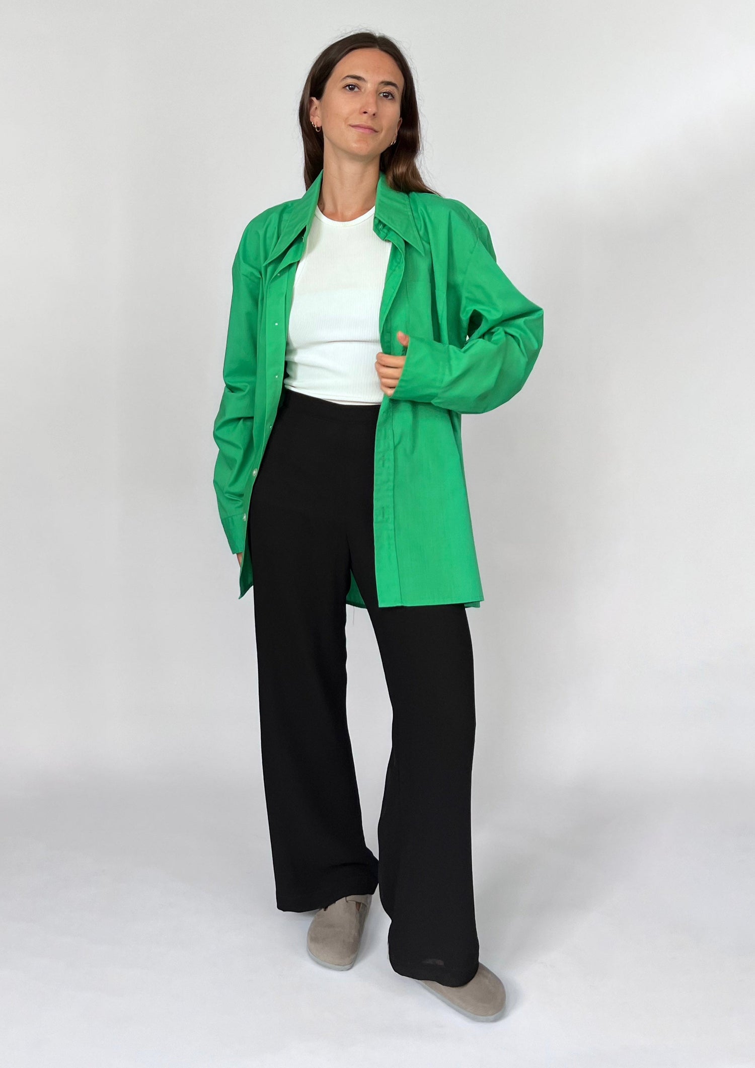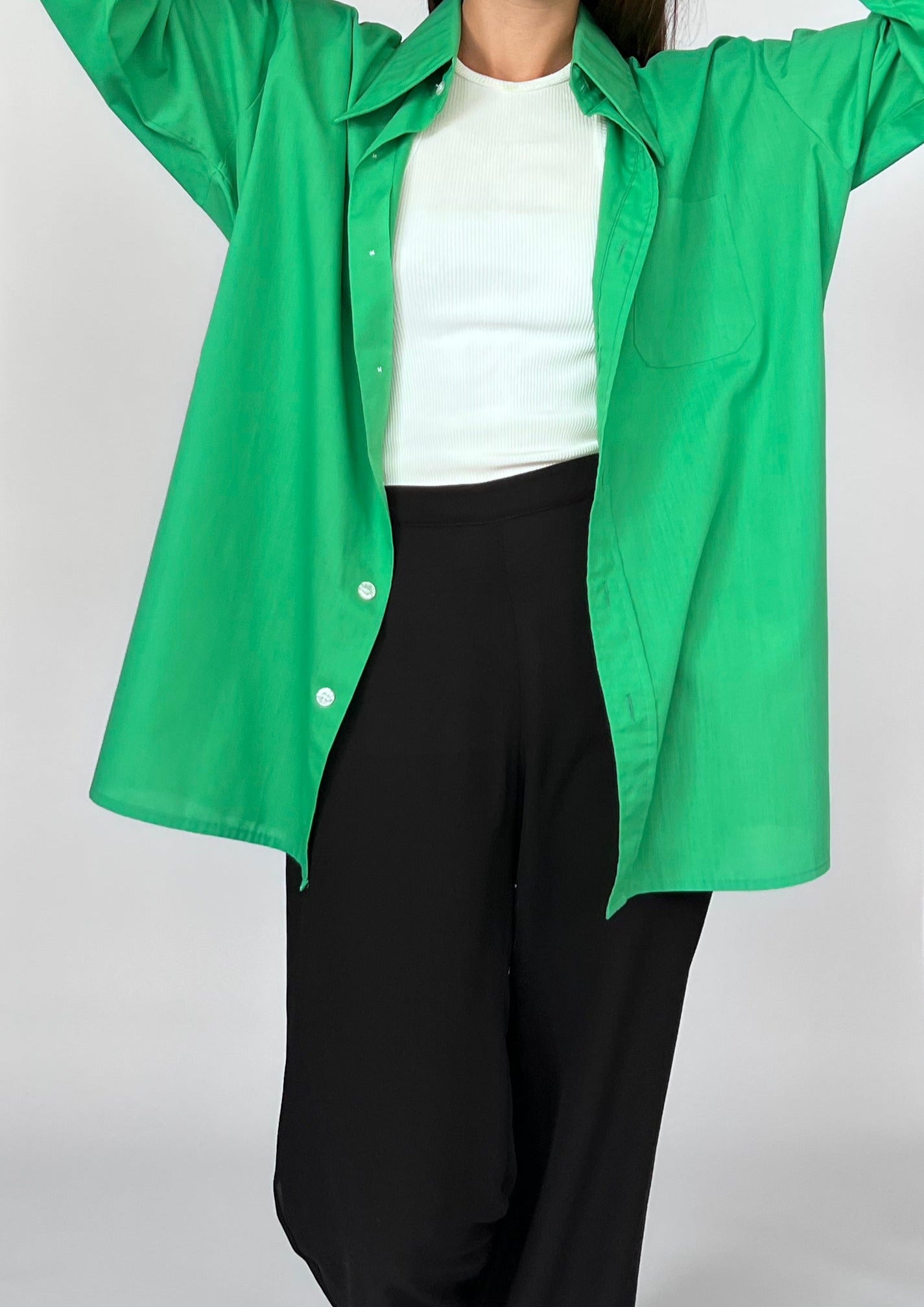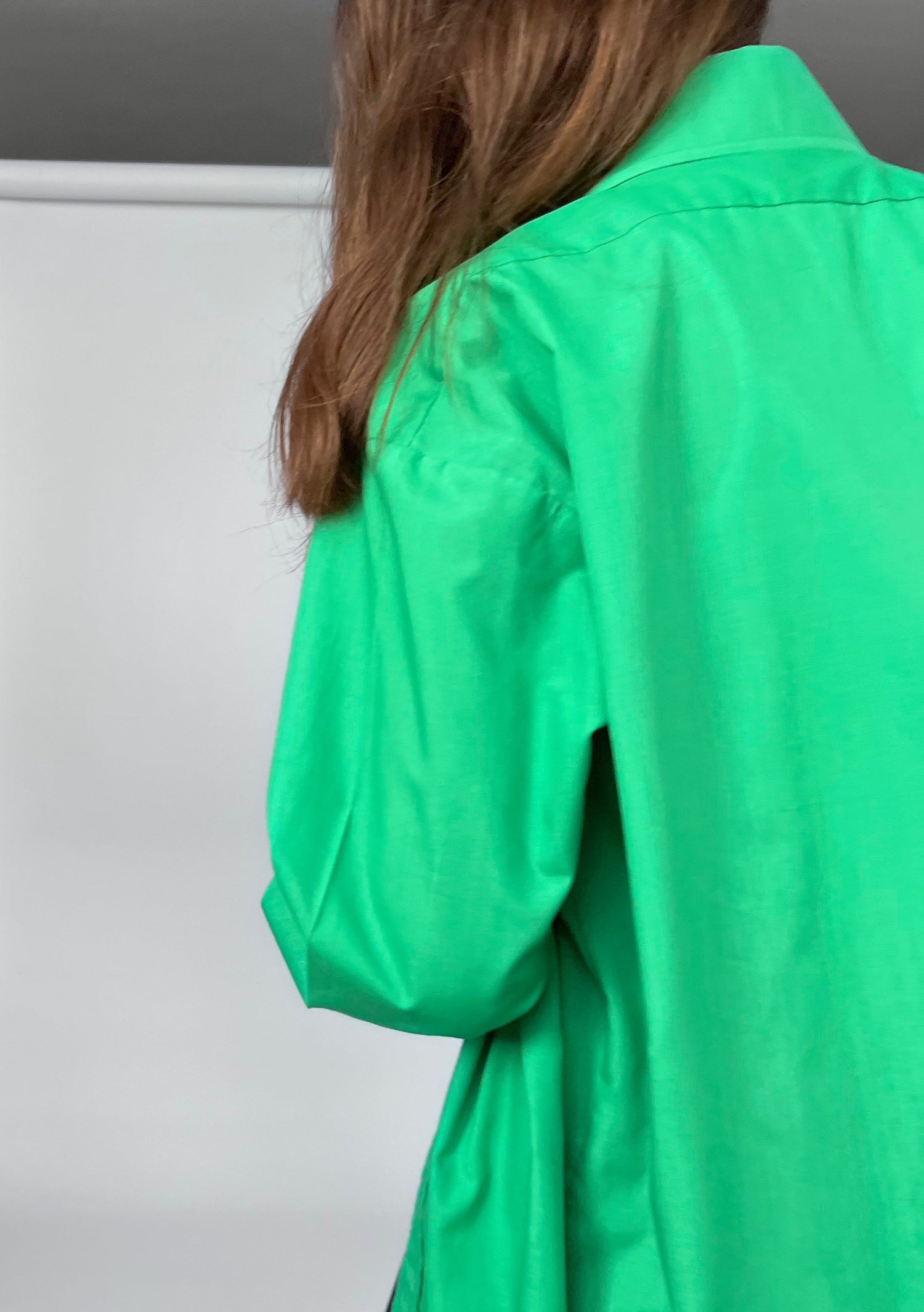 90s oversized, relaxed green shirt. Features a drop shoulder, oversized sleeves, longline length and a 70s style pointed collar.