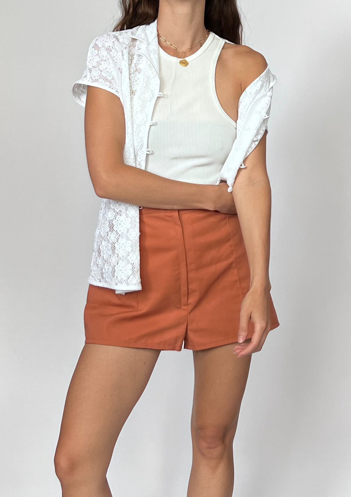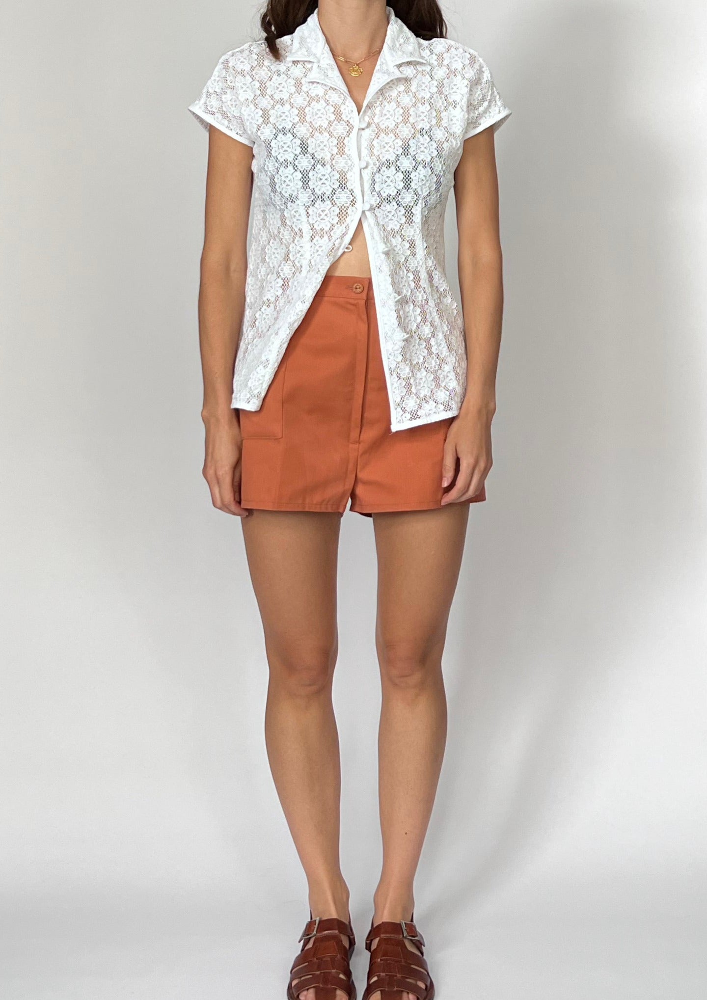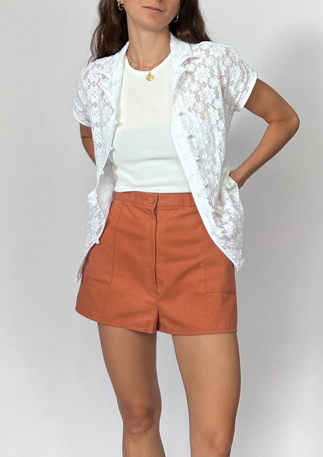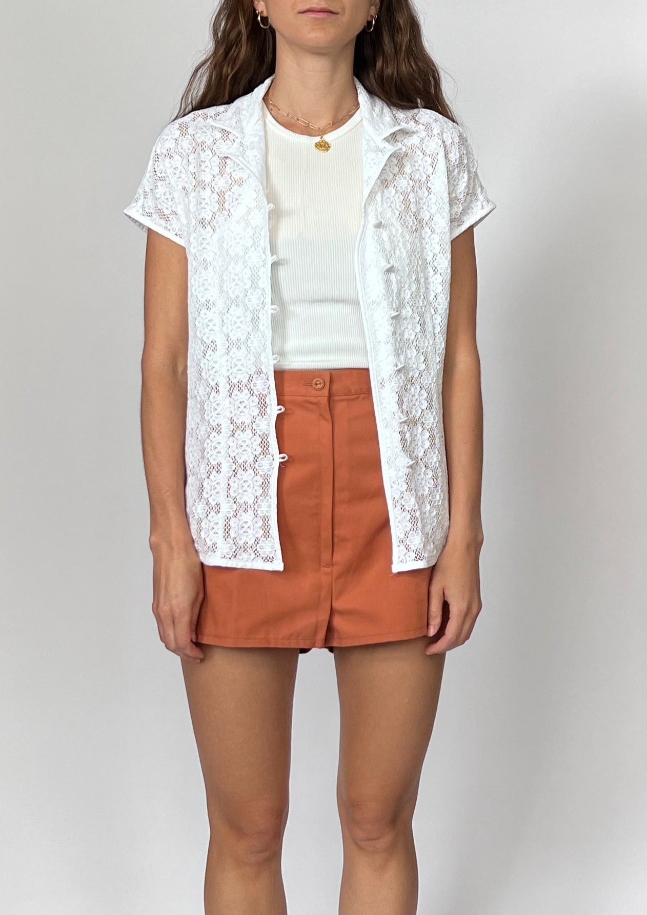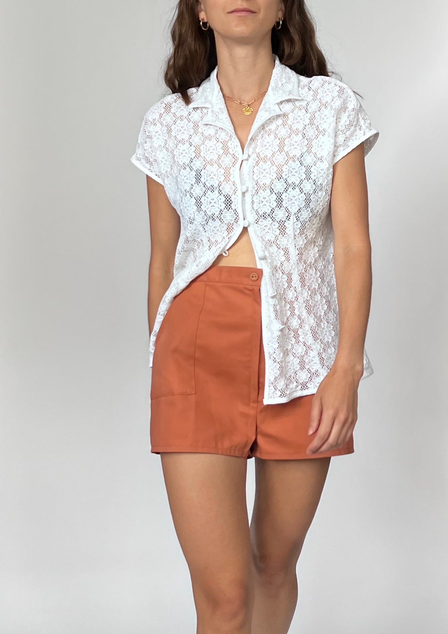 90s sheer shirt in a heavier cottony lace (no label) with a grown on cap sleeve and edge to edge button fastening. Made by St Michael, with beautiful taped finishing