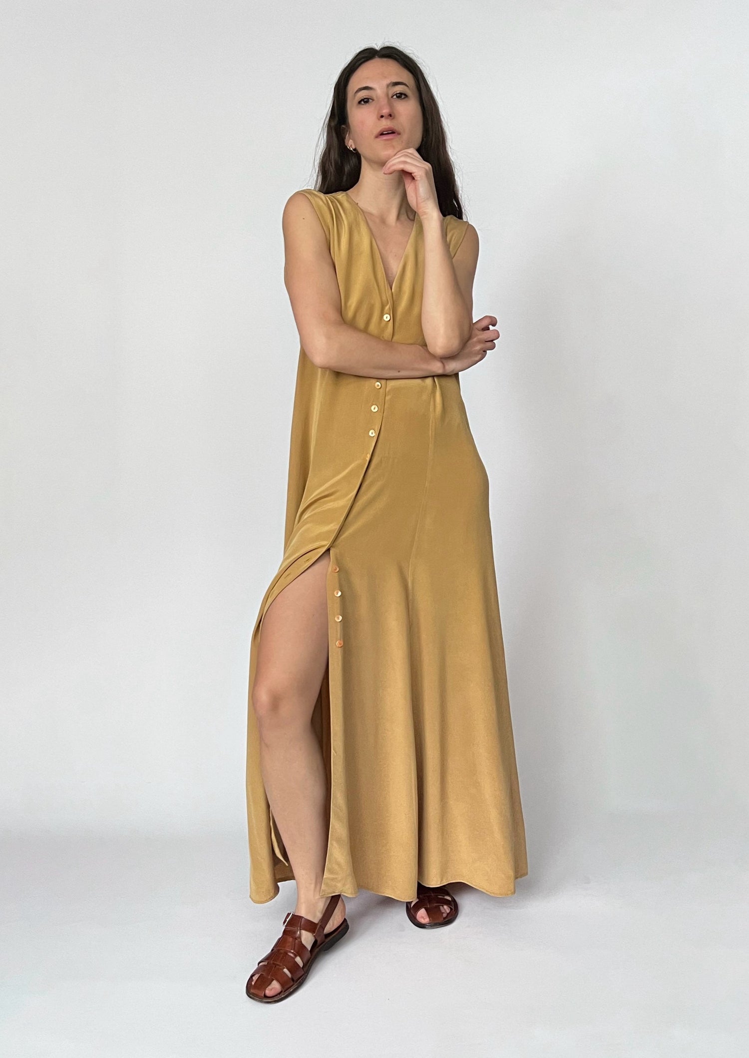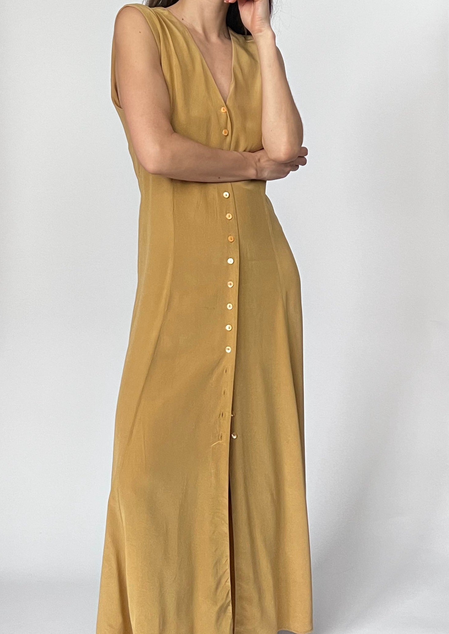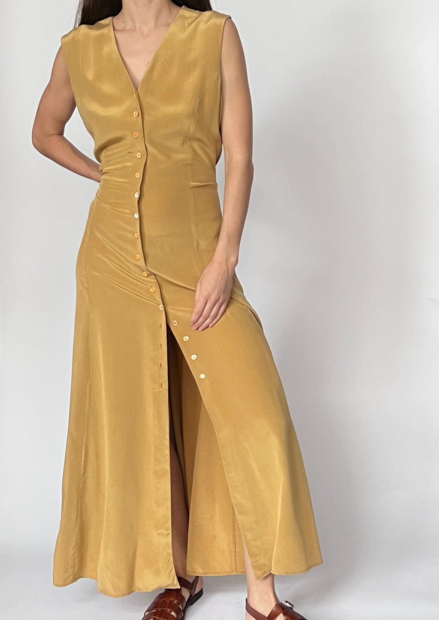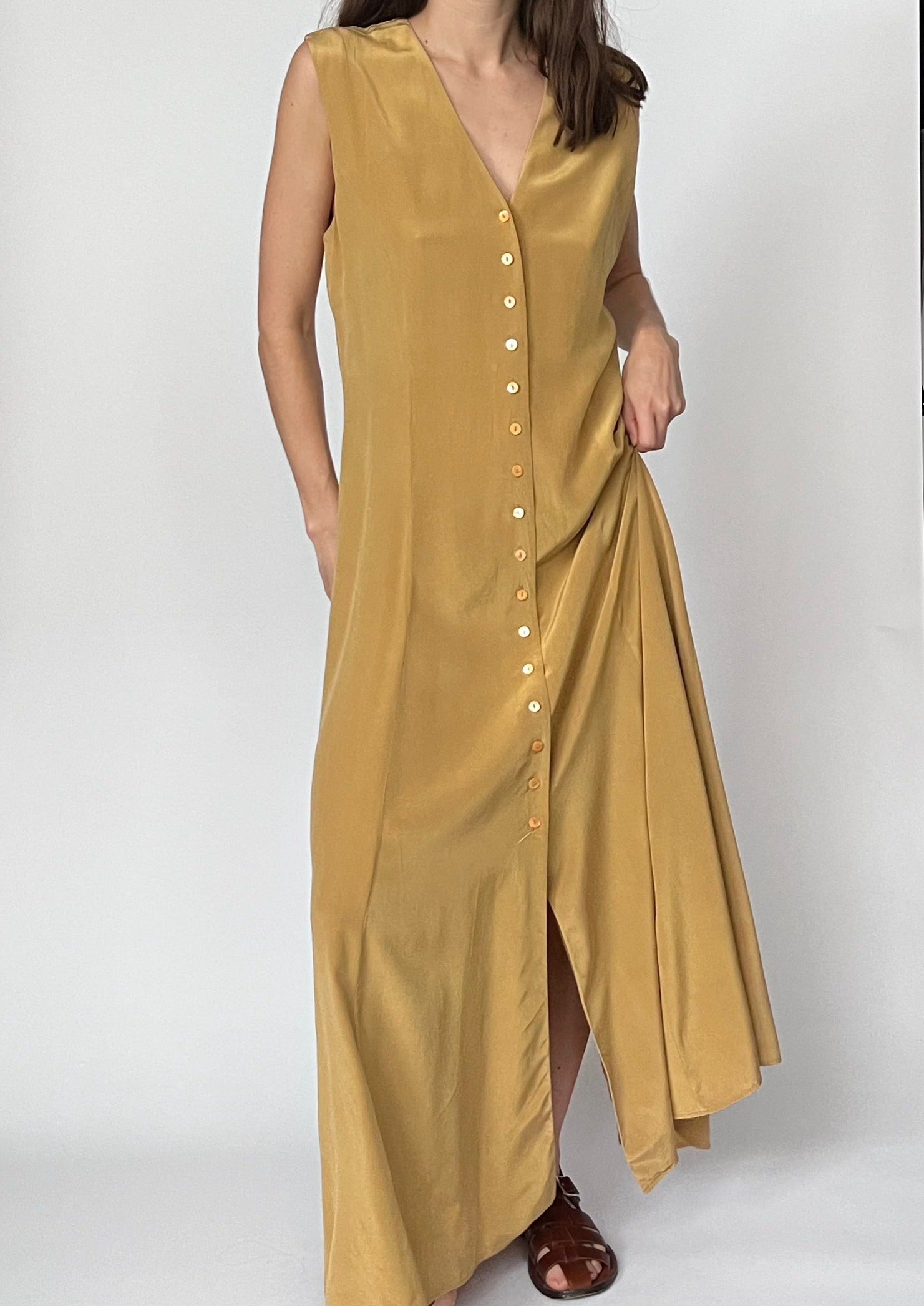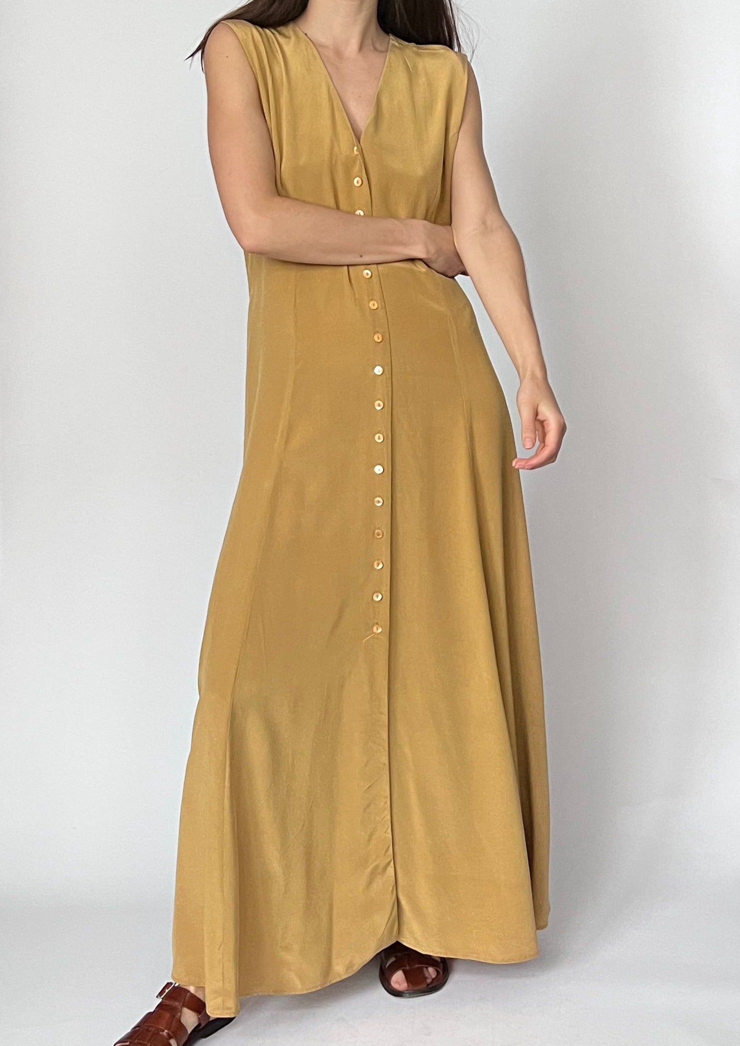 A maxi silk neutral dress with a yellow tone. Features a maxi hemline, button through fastening, seam detail and a tank neckline