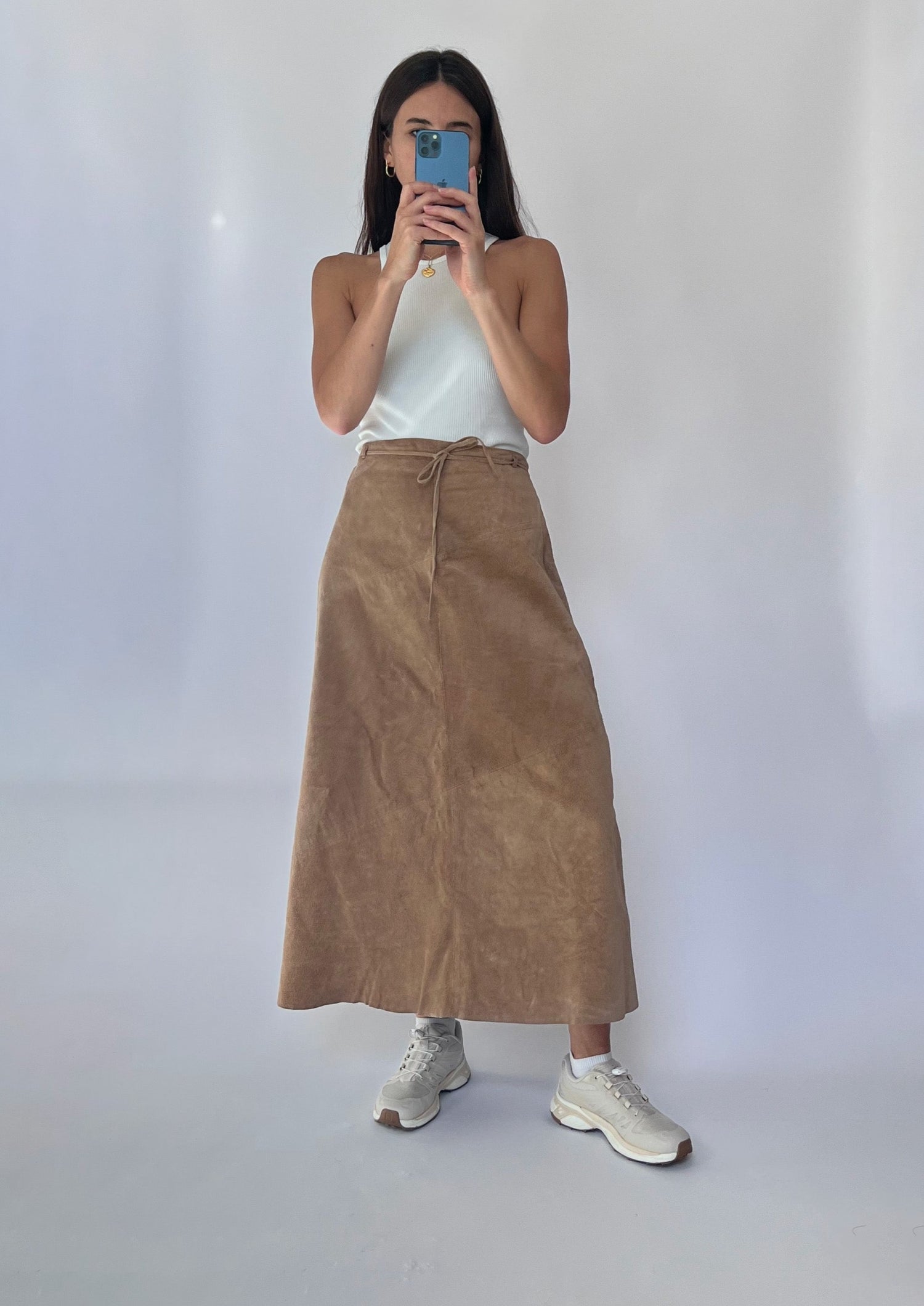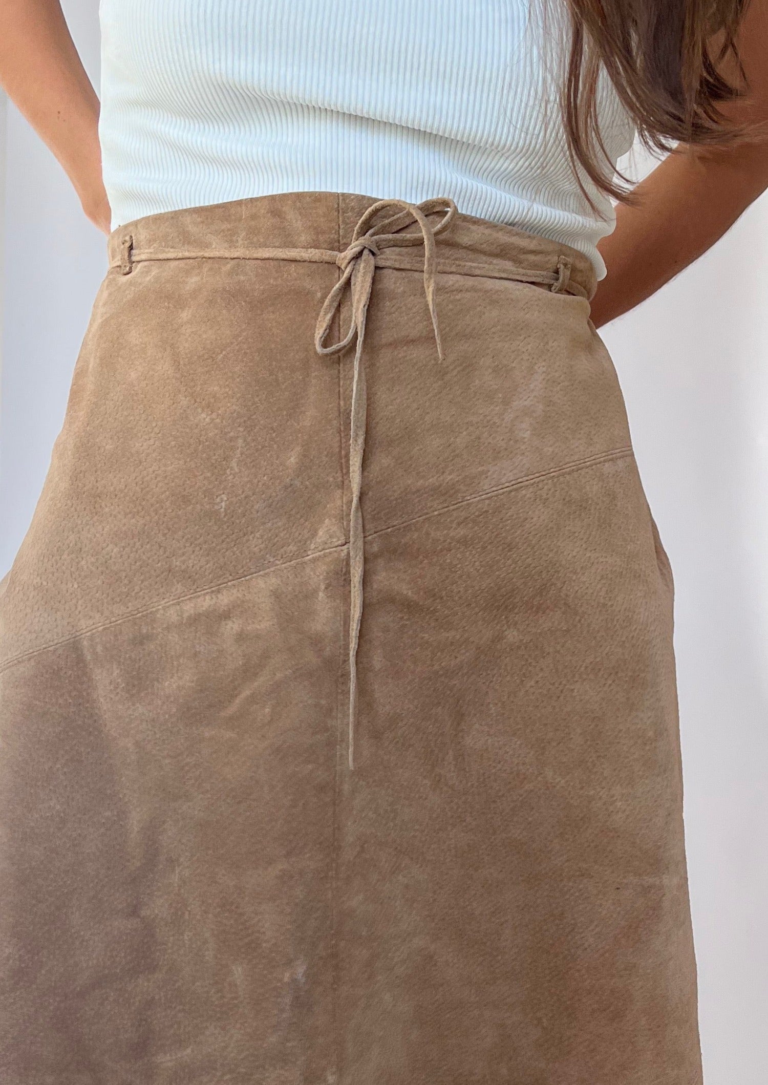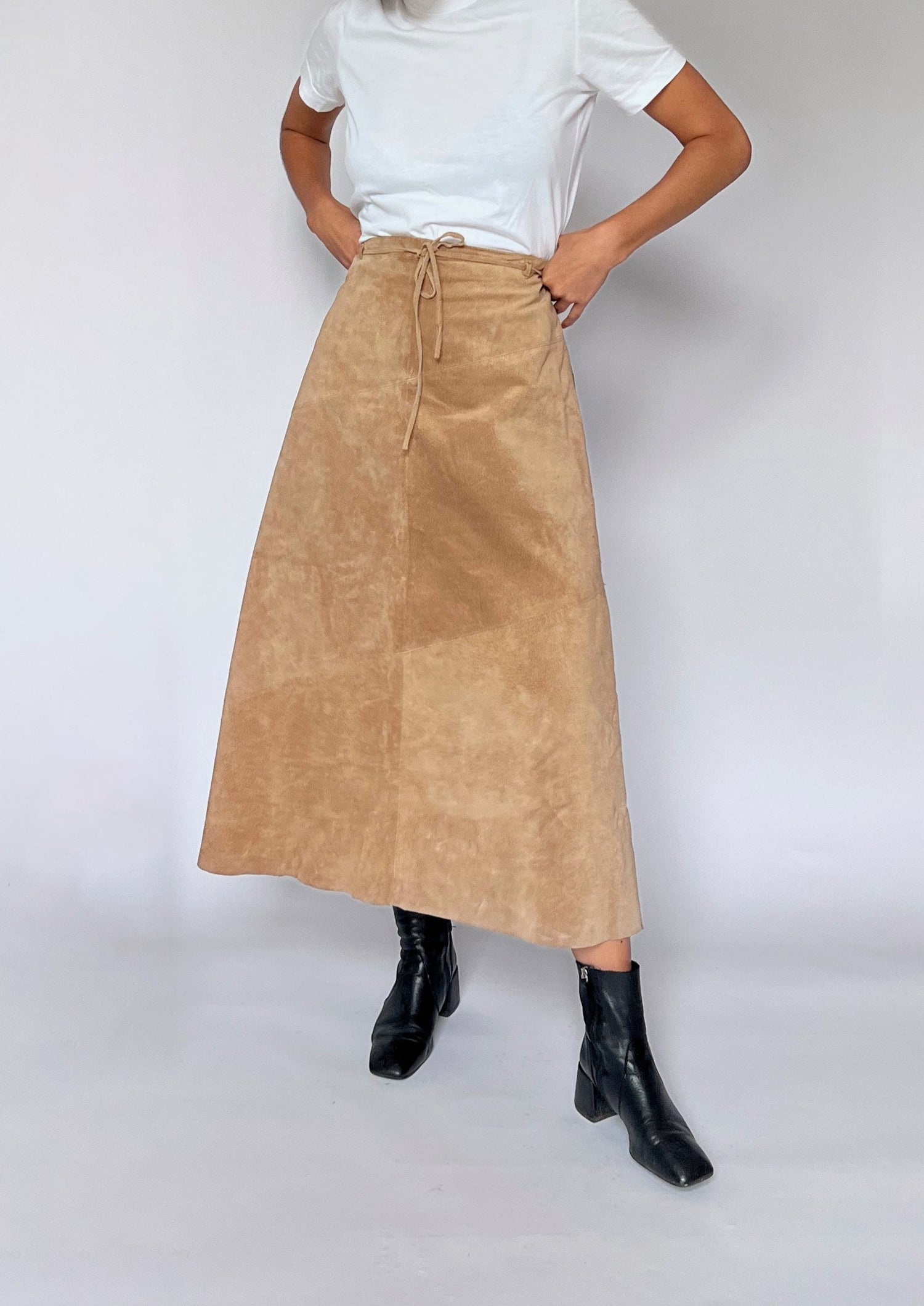 Vintage 70s suede midi skirt. Features an A-Line skirt shape in a midi length, a skinny waist tie and fastens with an invisible zip. Unique suede/leather with a subtle texture all over. Fully Lined. Can be pulled in slightly by waist tie.