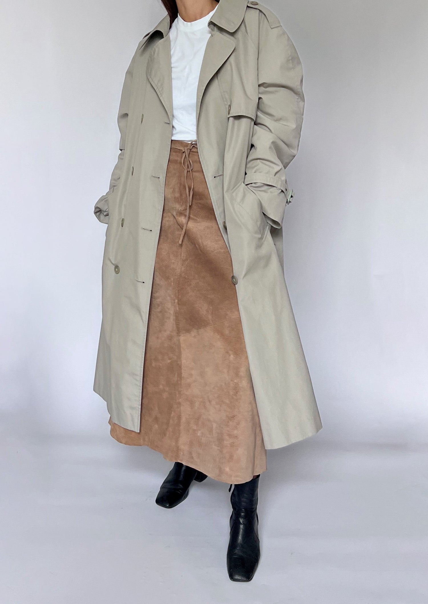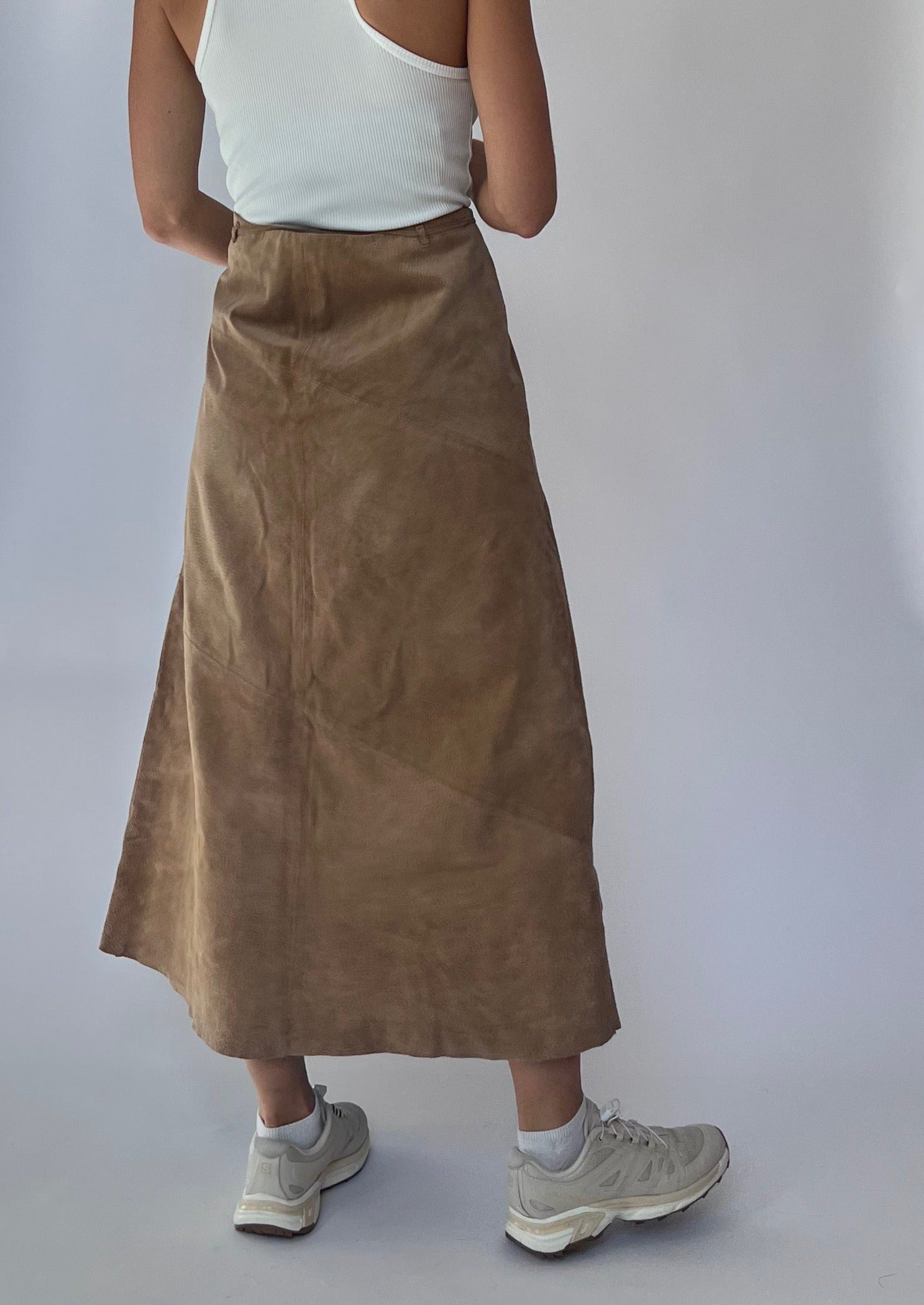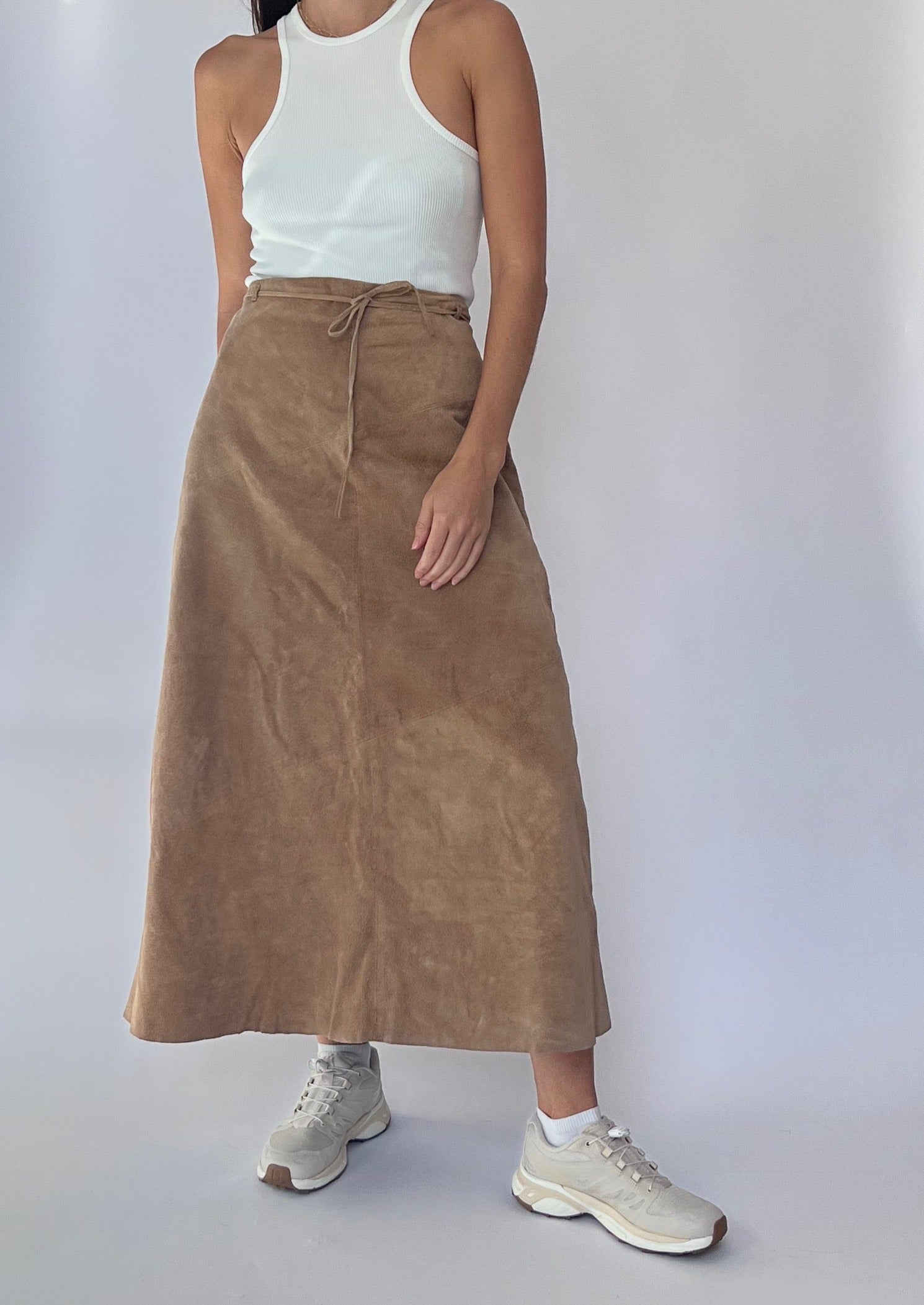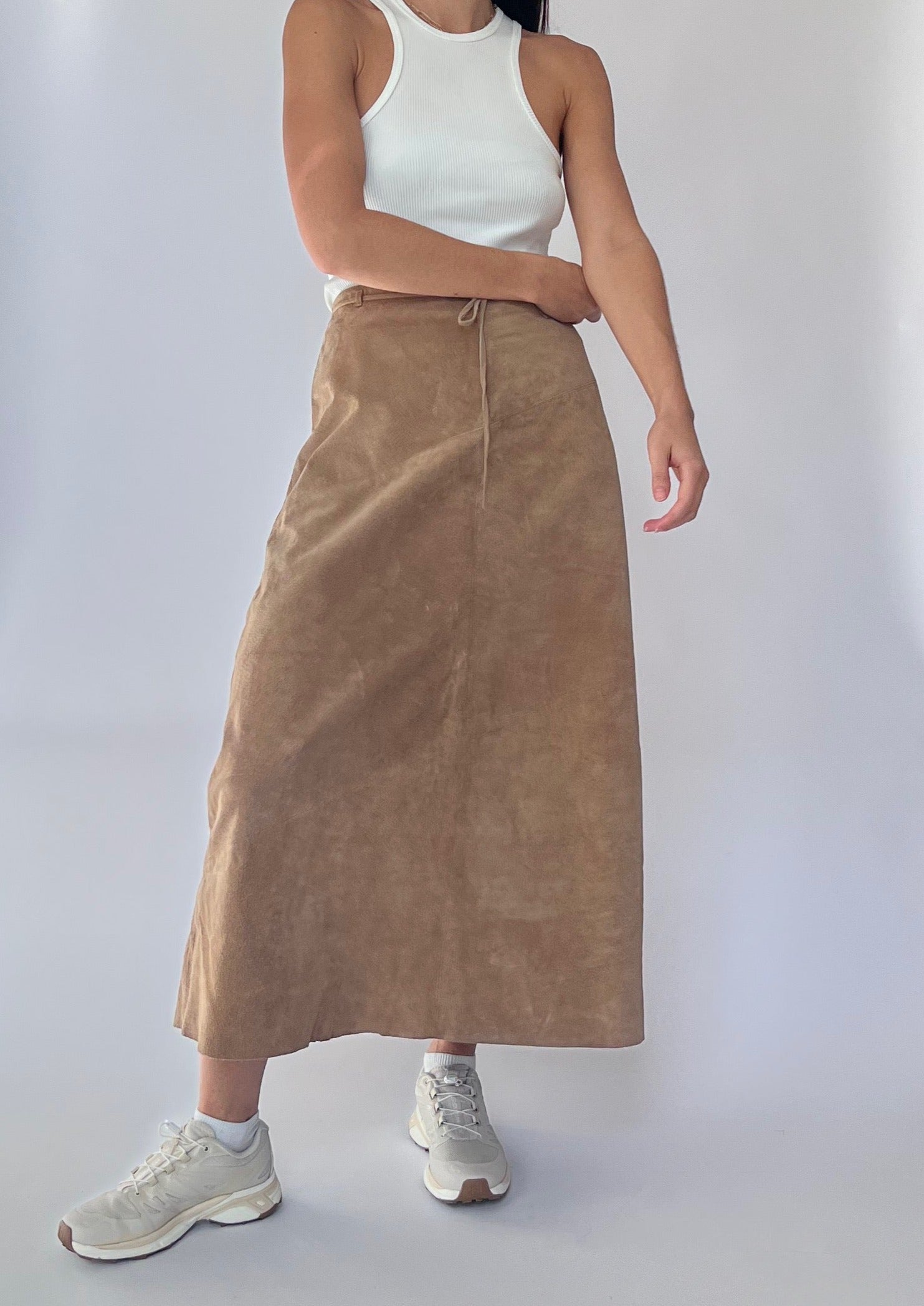 Vintage 70s suede midi skirt. Features an A-Line skirt shape in a midi length, a skinny waist tie and fastens with an invisible zip. Unique suede/leather with a subtle texture all over. Fully Lined. Can be pulled in slightly by waist tie.