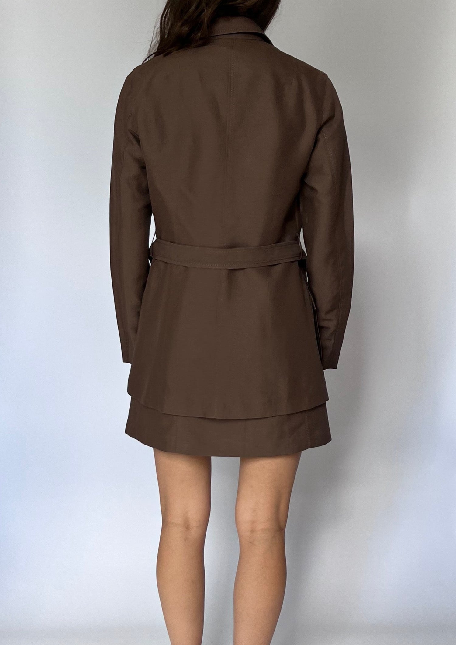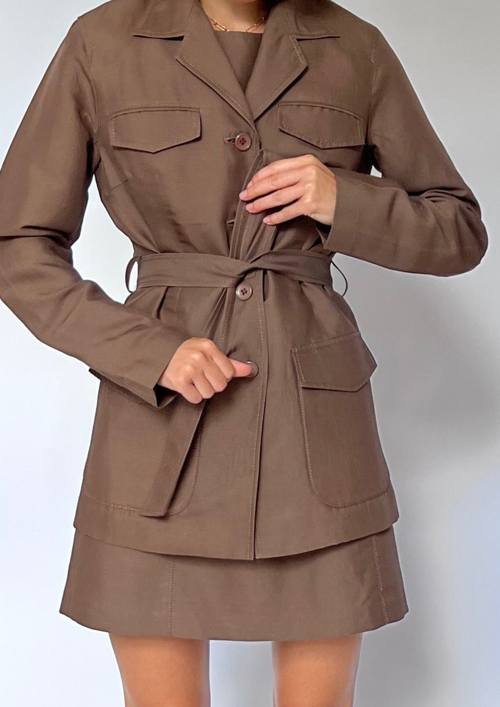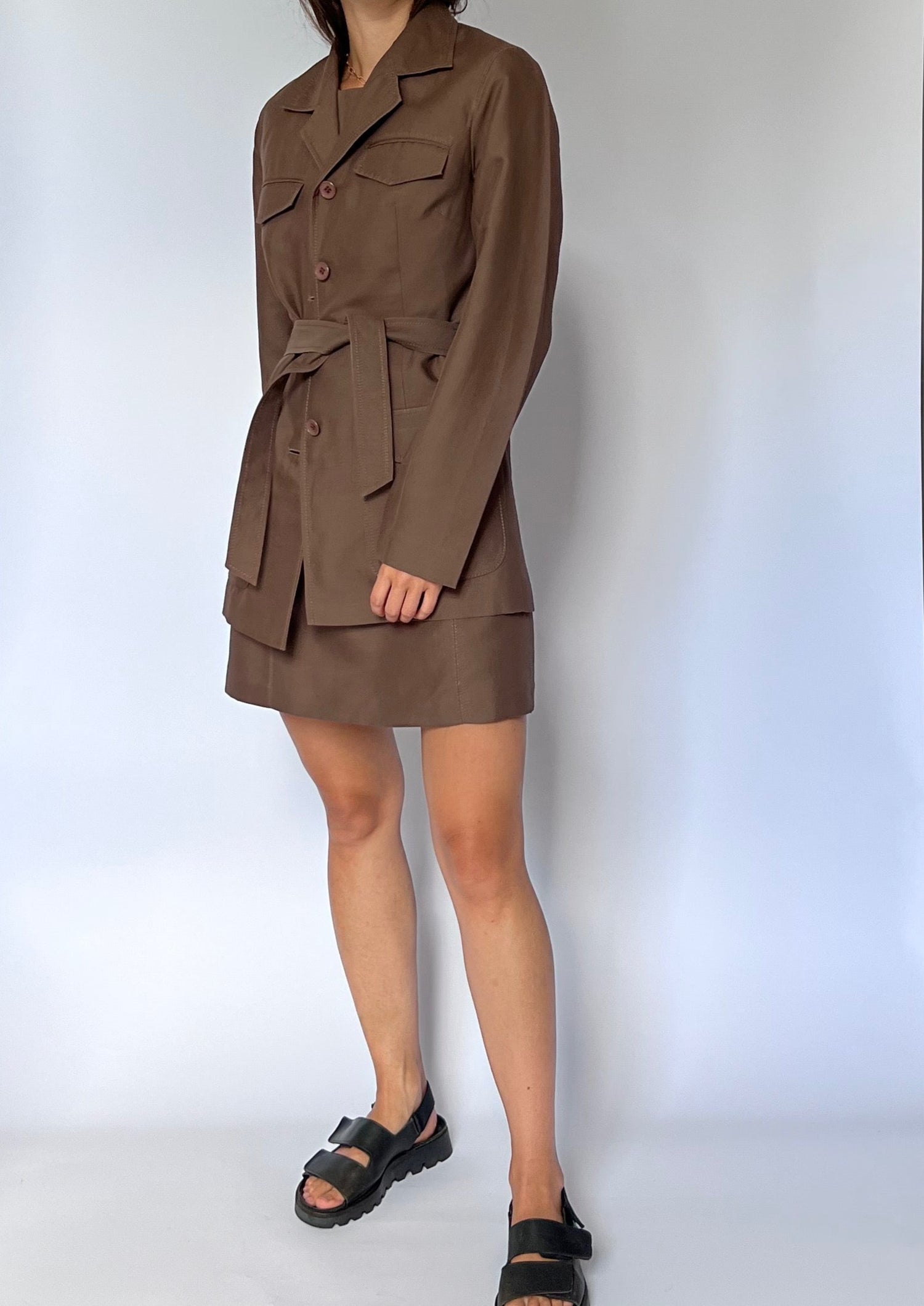 Vintage brown fitted 90s dress and belted jacket. Dress - features a fitted dress with a round neck, topstitch detail, pockets and a mini A-Line skirt. Zip to fasten at the back and fully lined. Jacket - features a long sleeve, unlined and buttons to fasten. A self belt to tie at the waist and pocket detail at the front. The open revere collar gives it a relaxed shape.