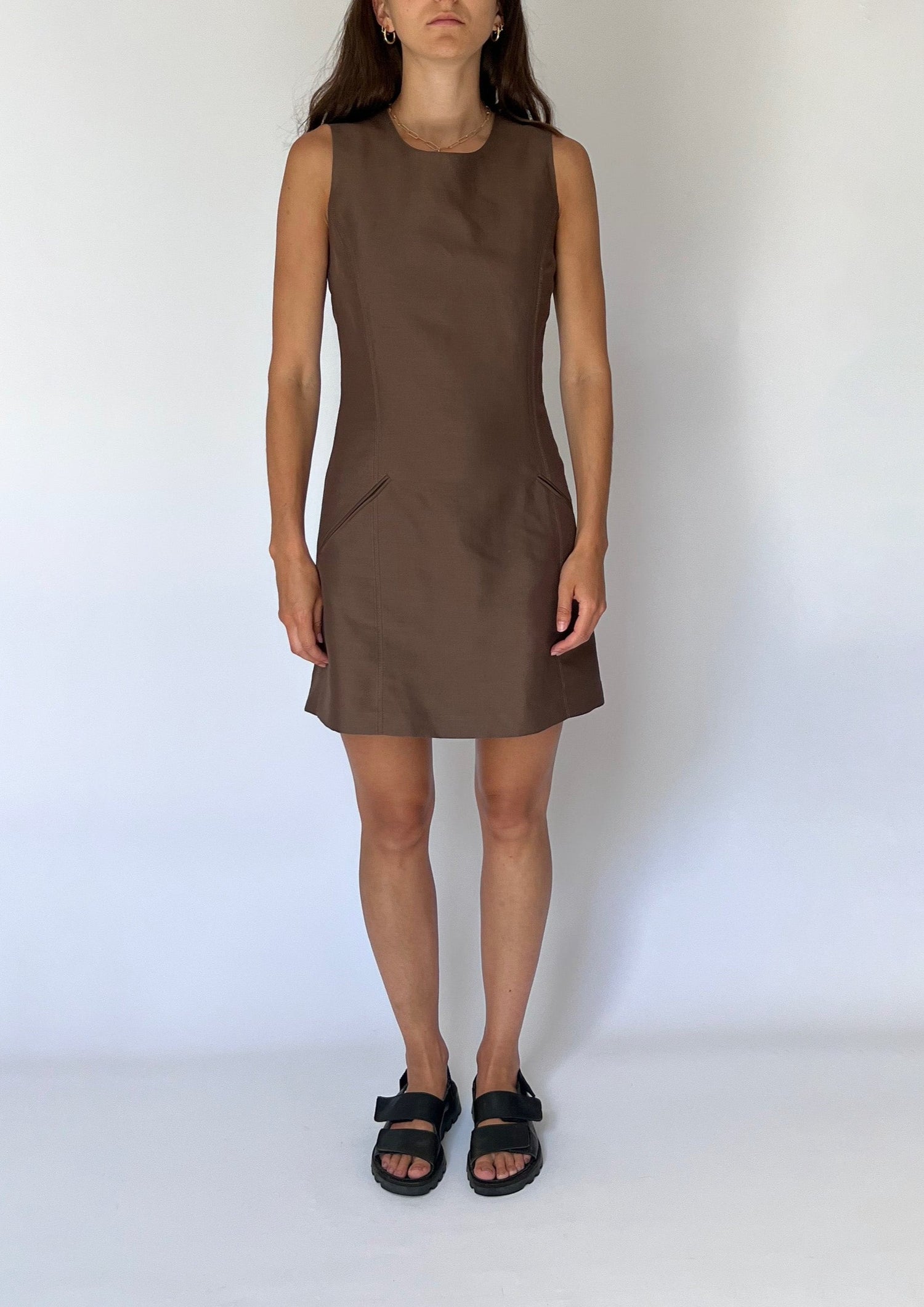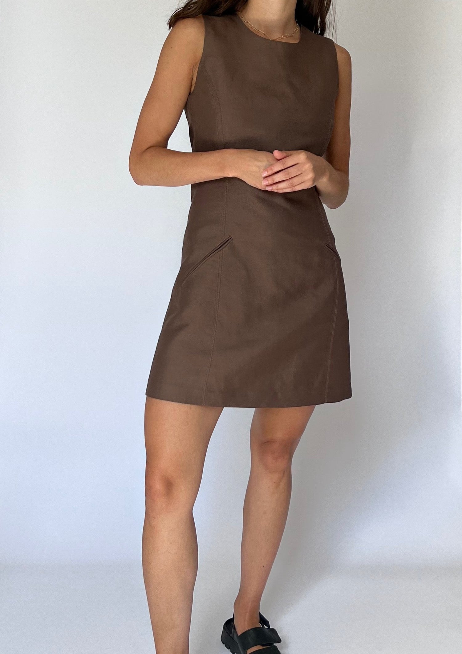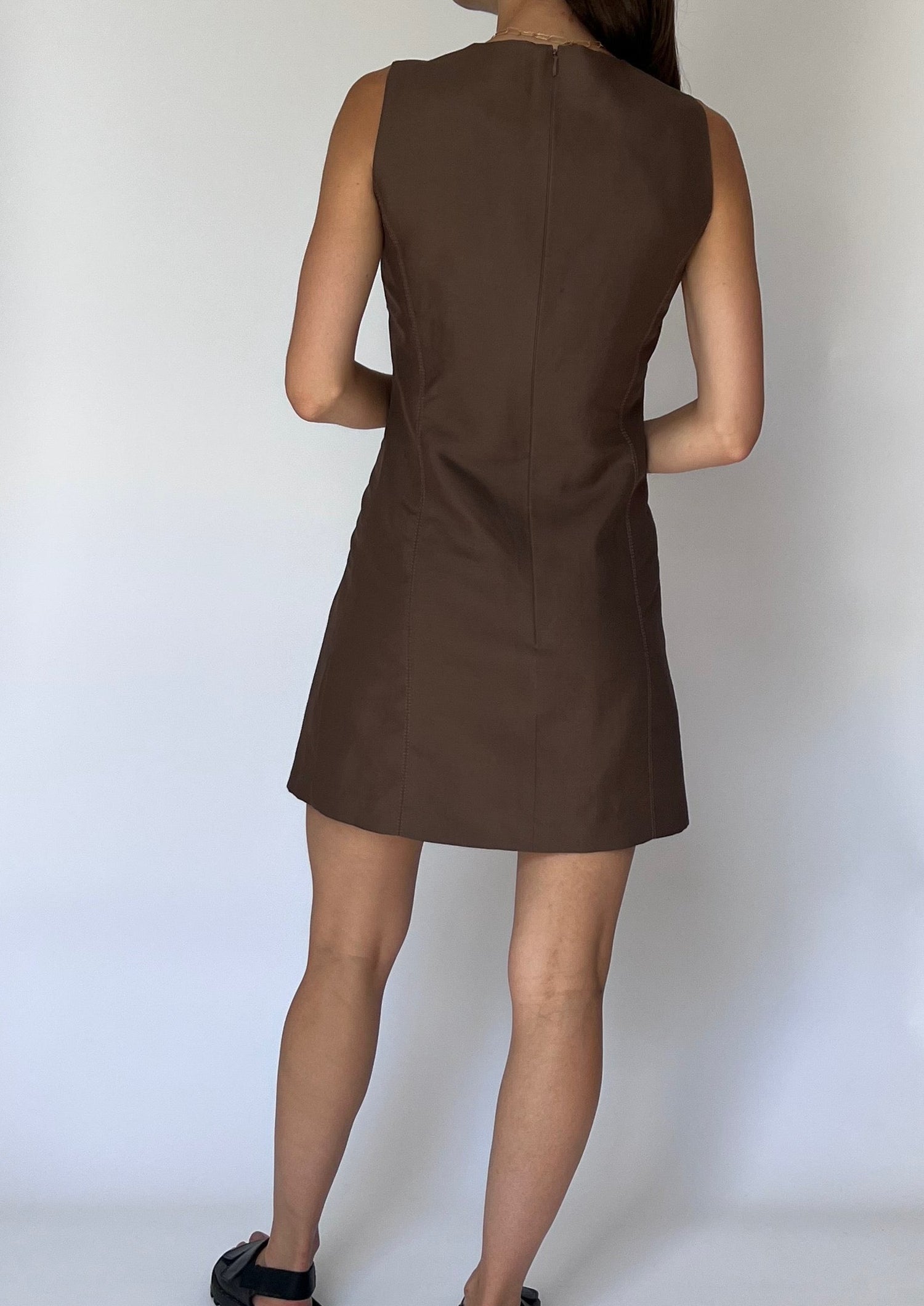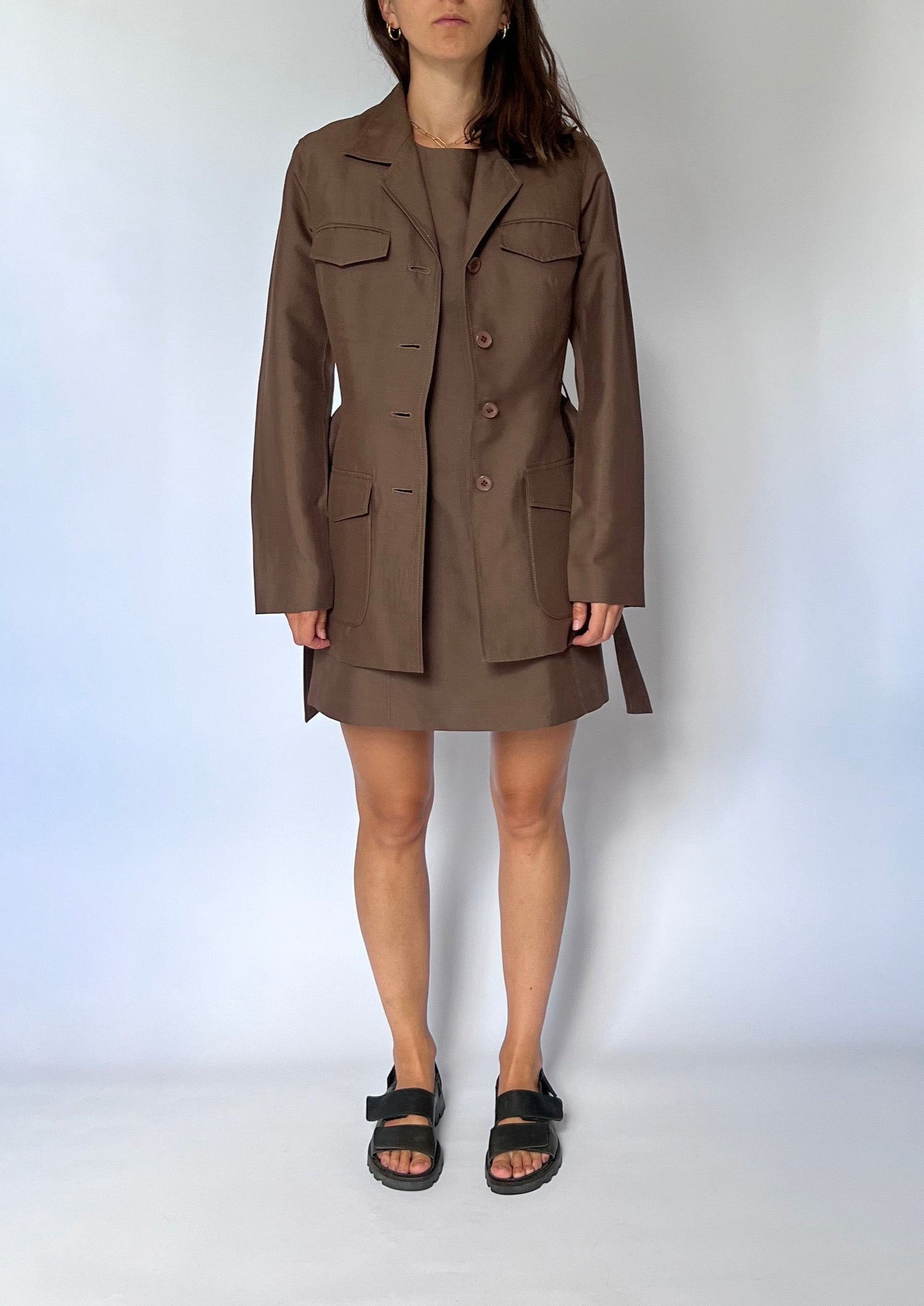 Vintage brown fitted 90s dress and belted jacket. Dress - features a fitted dress with a round neck, topstitch detail, pockets and a mini A-Line skirt. Zip to fasten at the back and fully lined. Jacket - features a long sleeve, unlined and buttons to fasten. A self belt to tie at the waist and pocket detail at the front. The open revere collar gives it a relaxed shape.