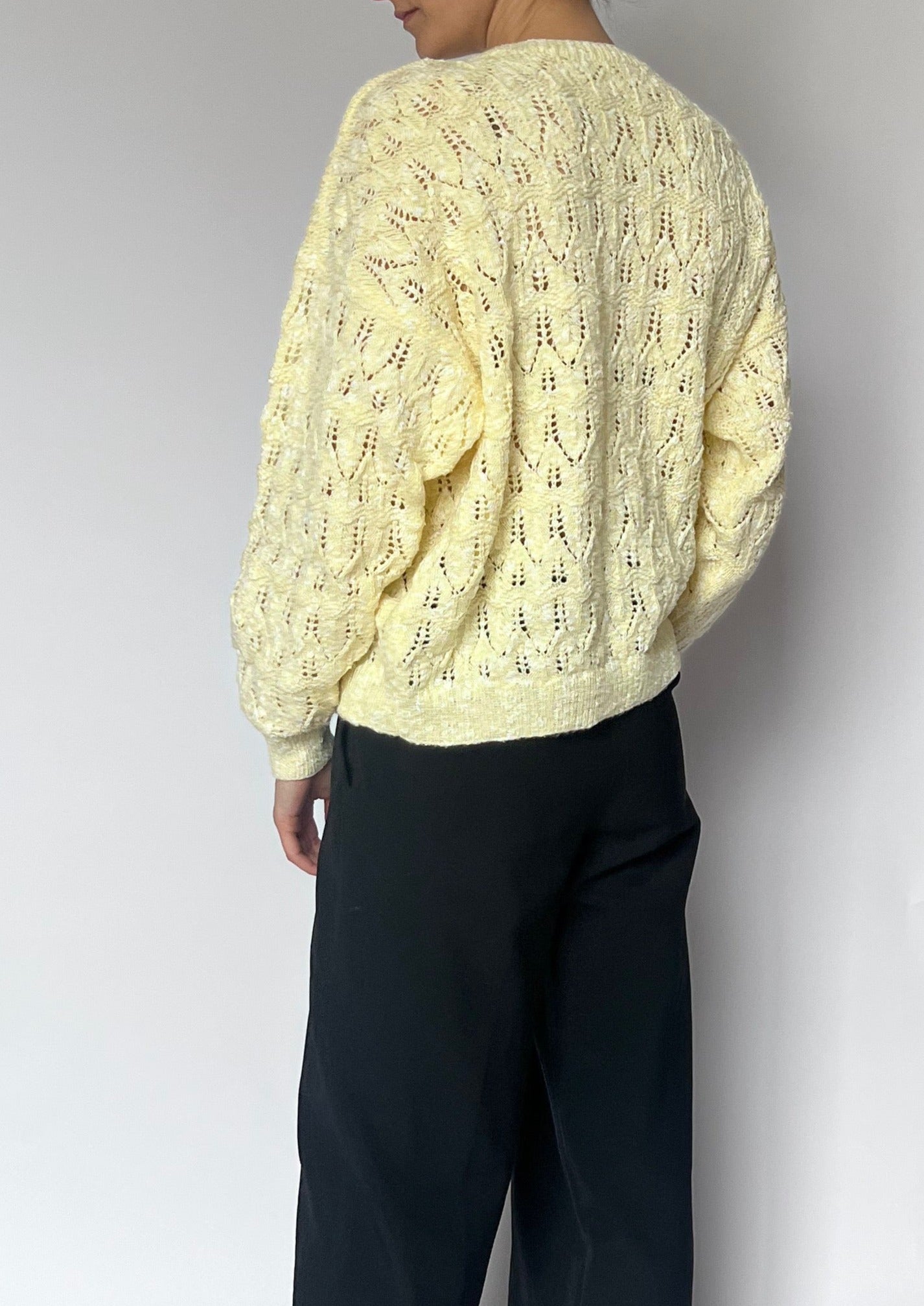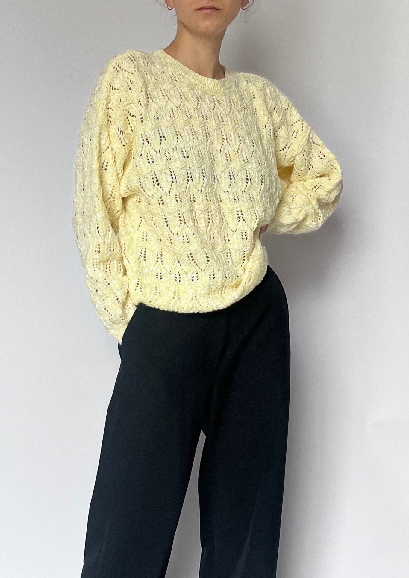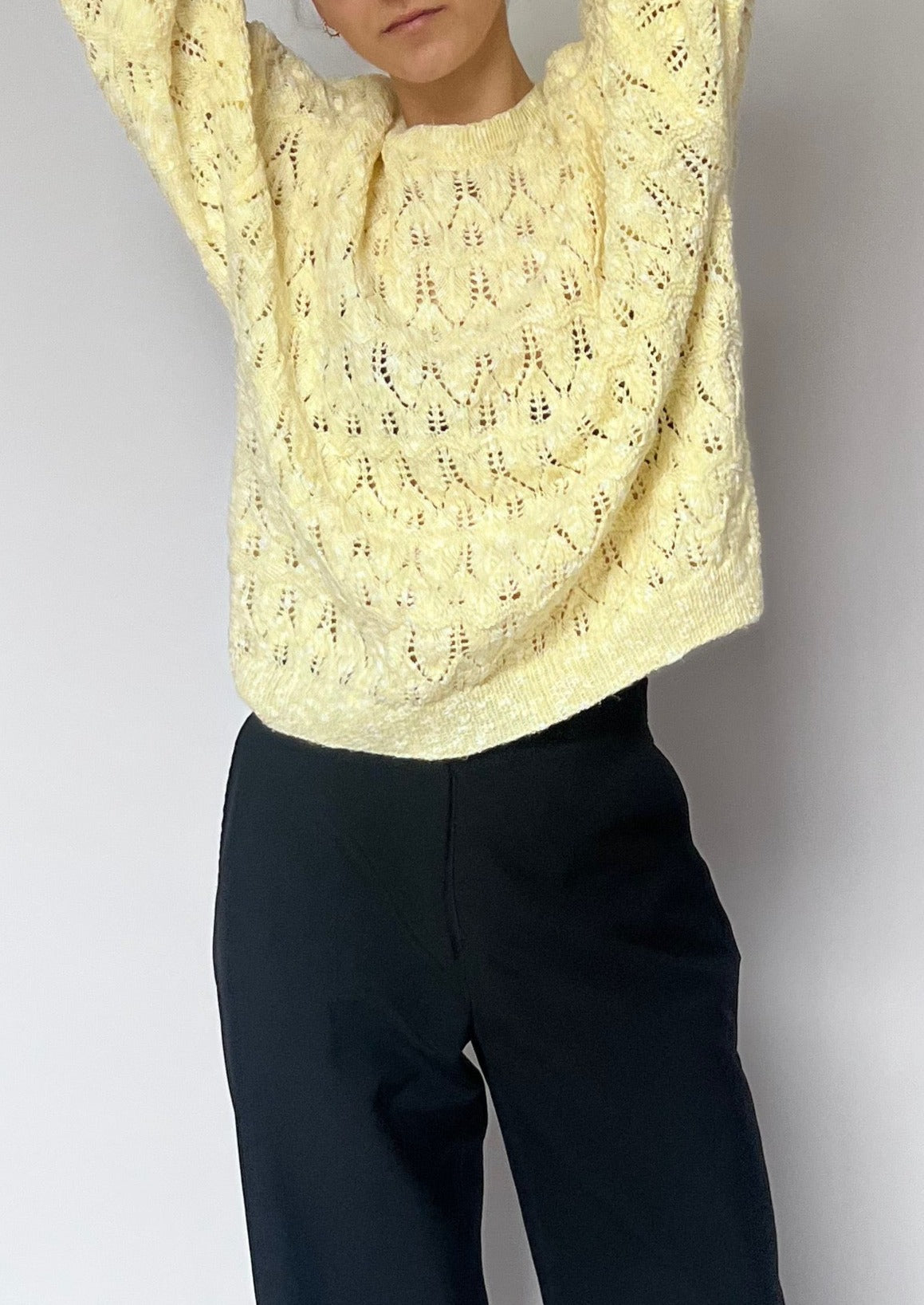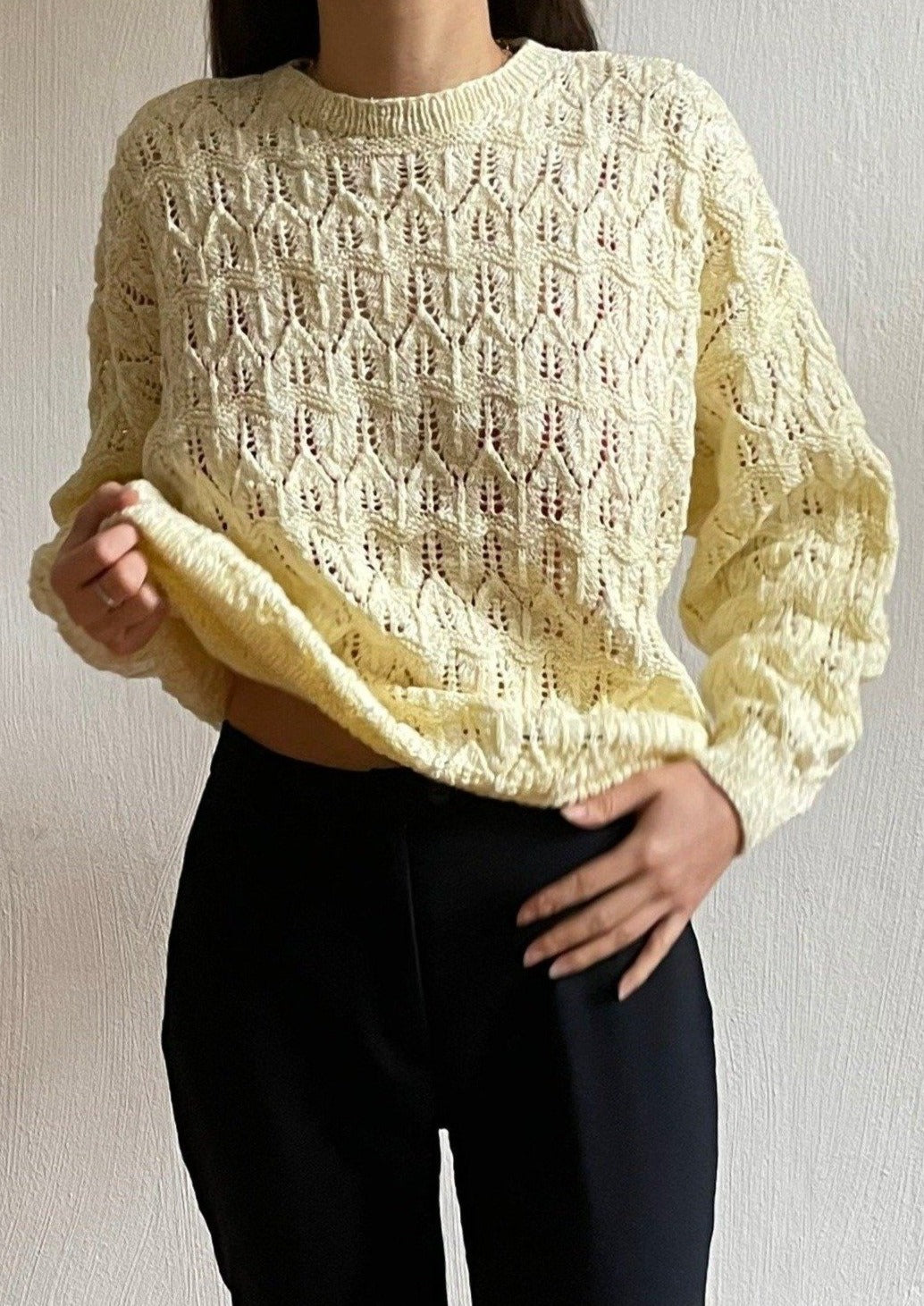 Vintage hand knitted jumper in a soft, pastel yellow. Hand knitted in an open knit and a timeless texture. Features a dropped shoulder, volume sleeve and a rib neck, hem and cuff.