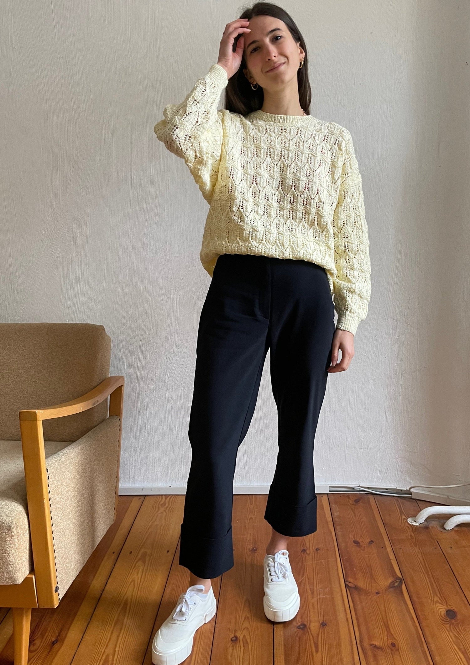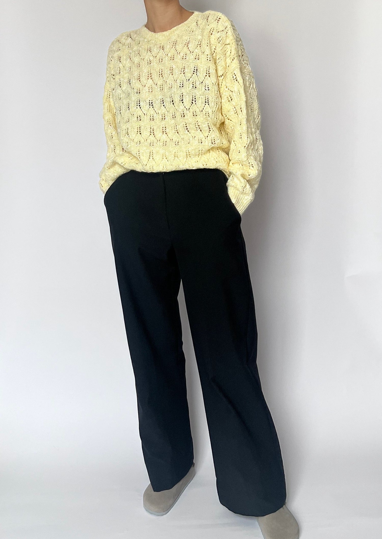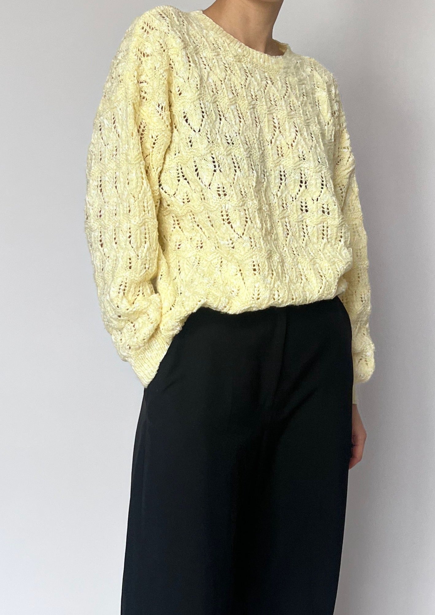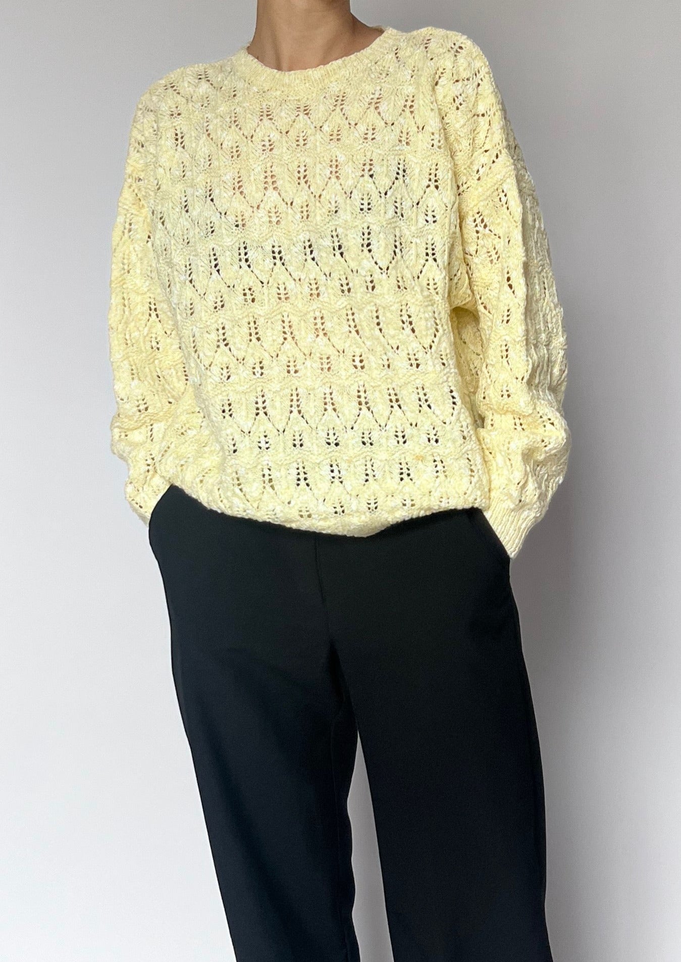 Vintage hand knitted jumper in a soft, pastel yellow. Hand knitted in an open knit and a timeless texture. Features a dropped shoulder, volume sleeve and a rib neck, hem and cuff.