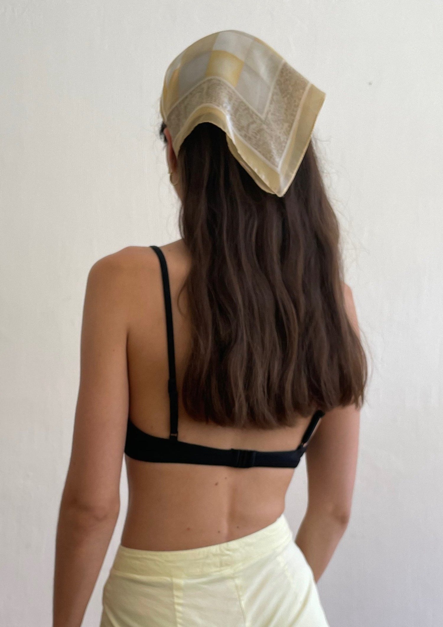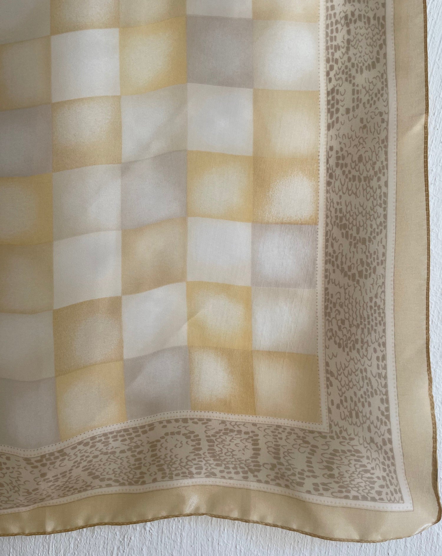 Satin scarf in a neutral check. Square scarf with a beige, yellow and white design. Wear as a head scarf, neck scarf or to use Furoshiki to wrap presents!