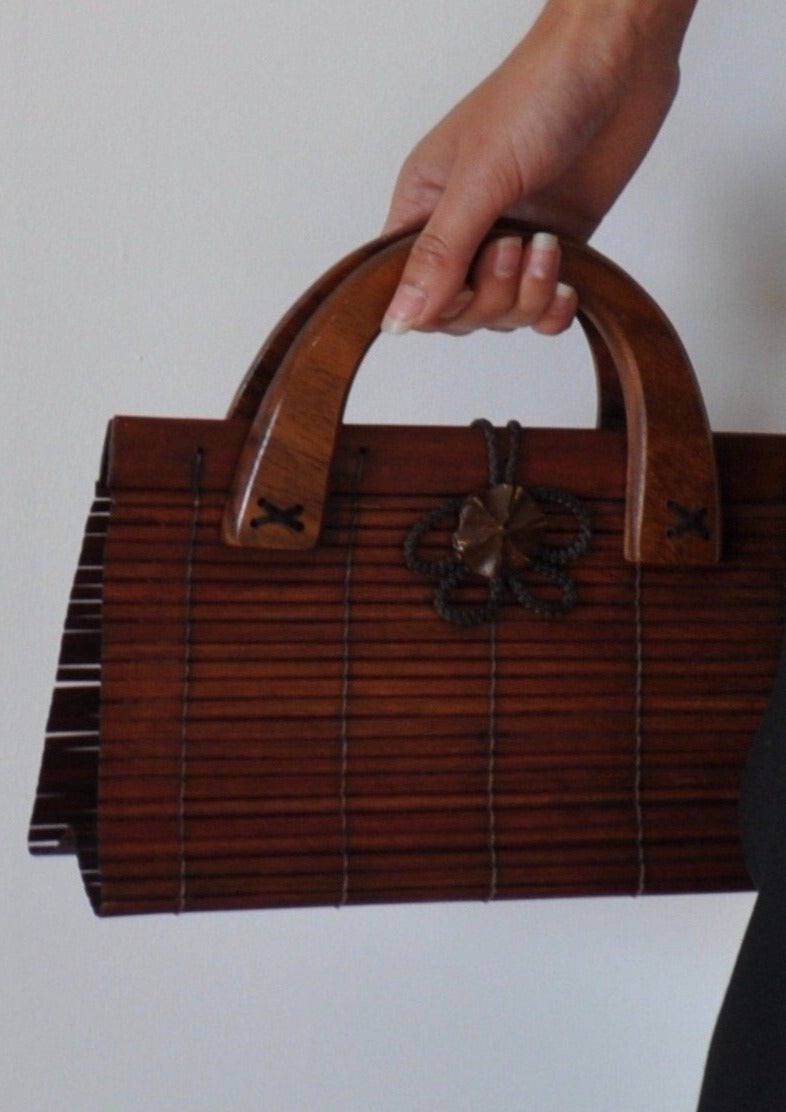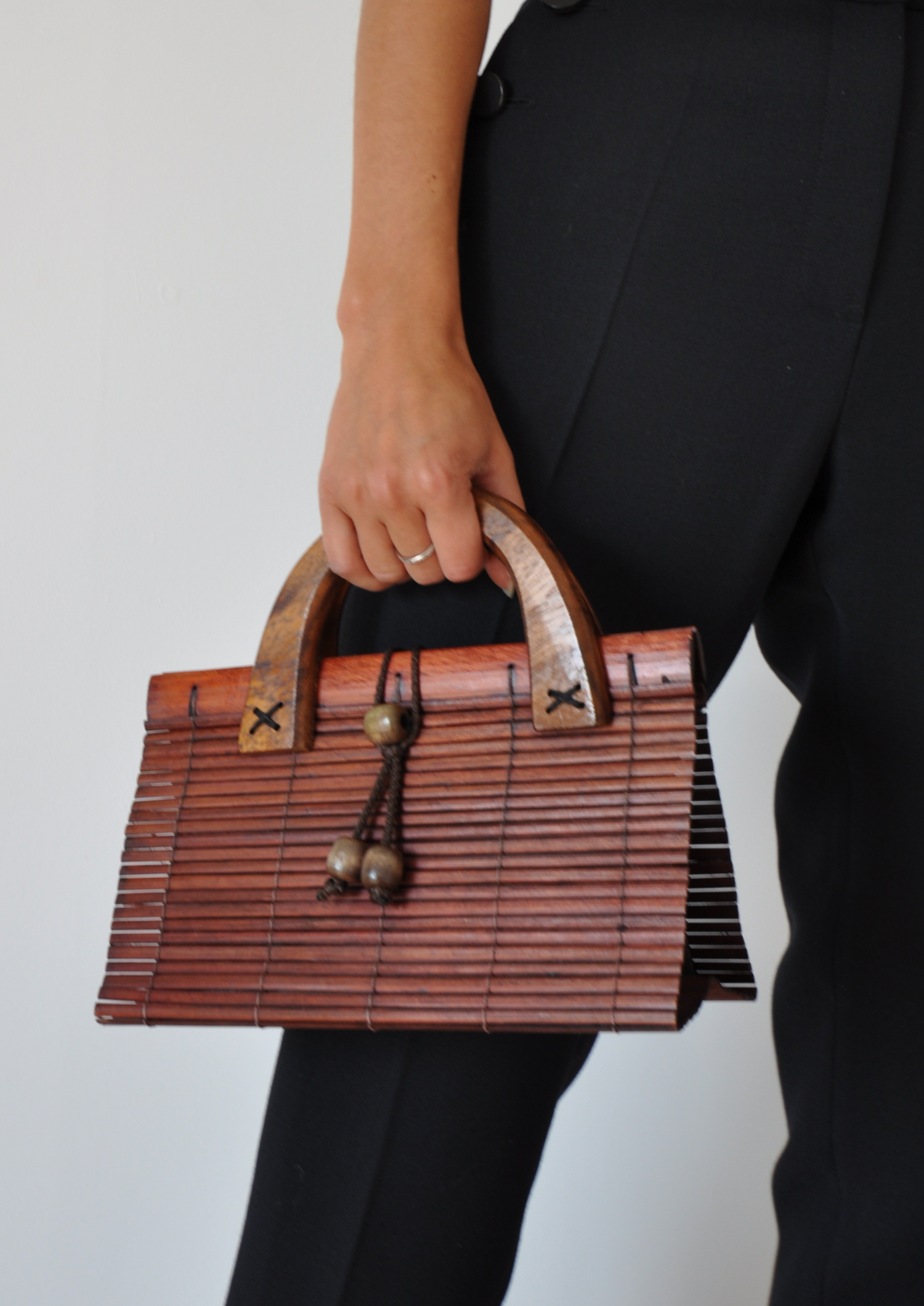 Vintage Wooden Bag with wooden handles and bag slats. Inner bag with internal pocket. Beaded detail, lined in cotton