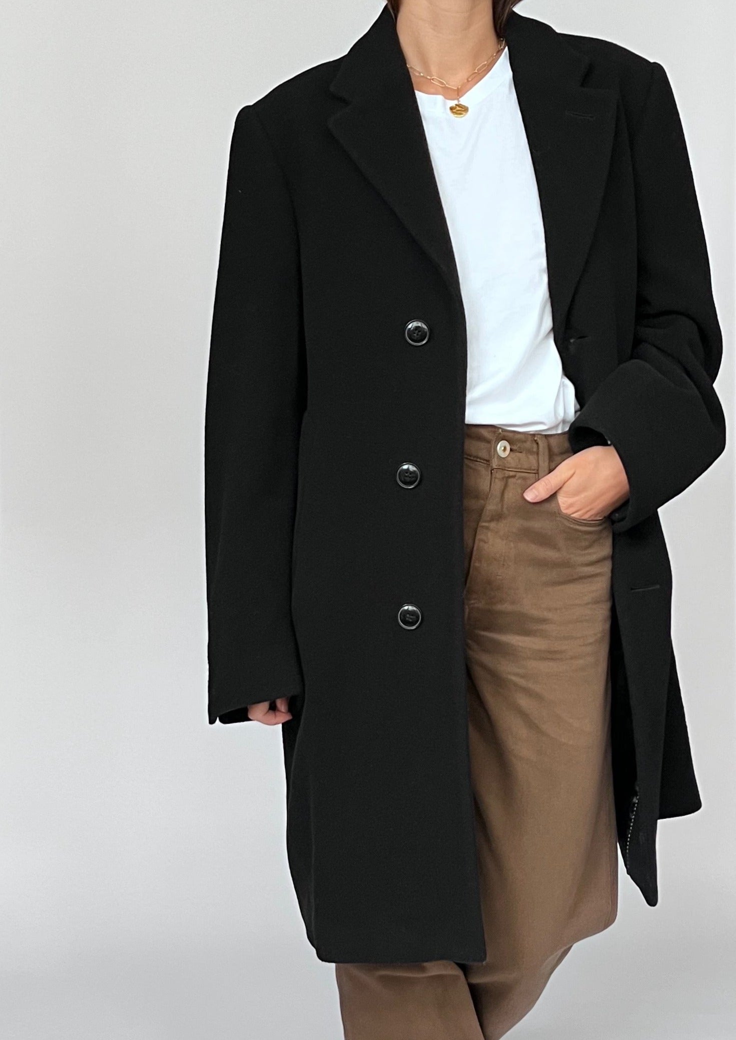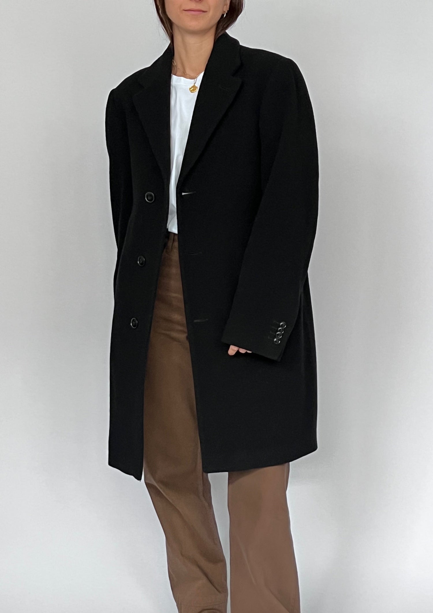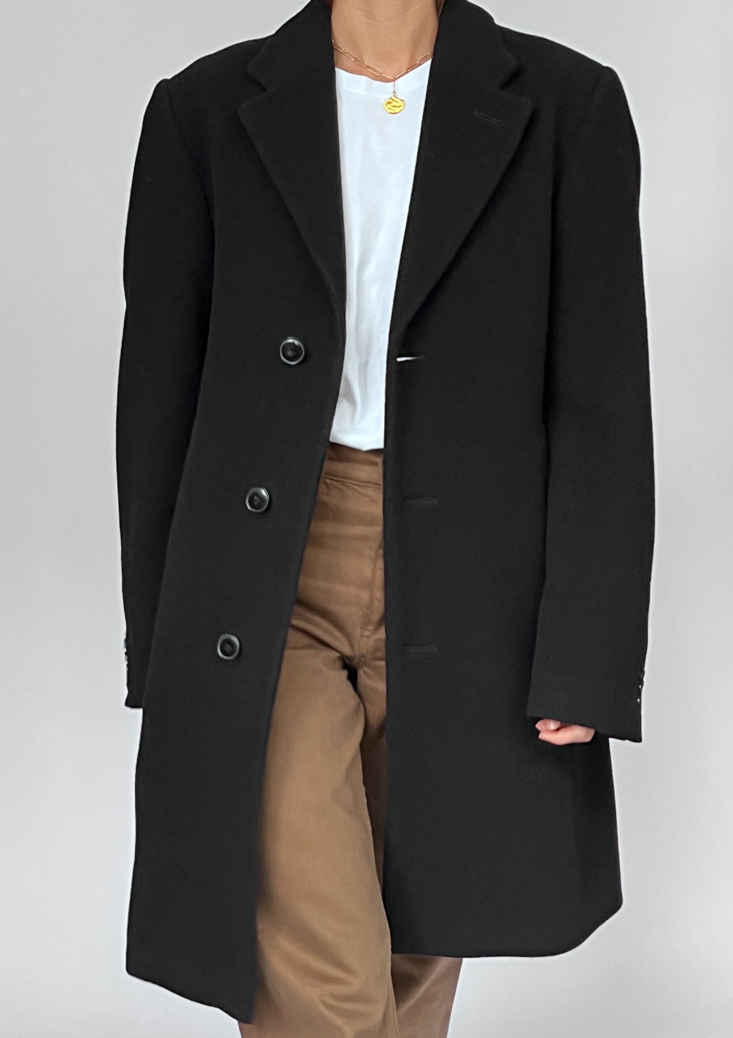 90s Classic black shorter length wool coat. Features two side pockets, a button fastening, fully lined and a clean cut. A smarter fit.