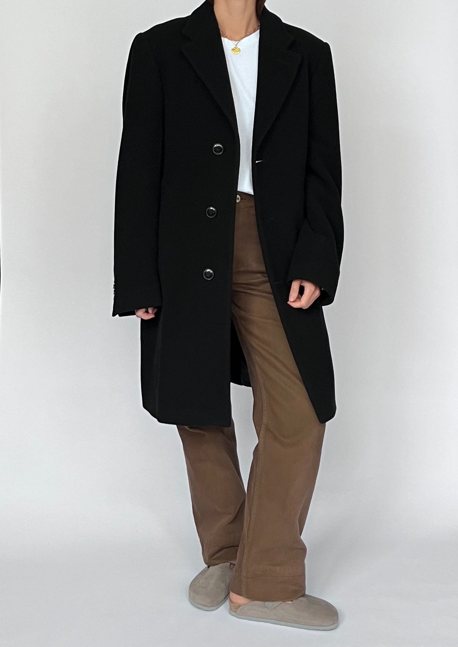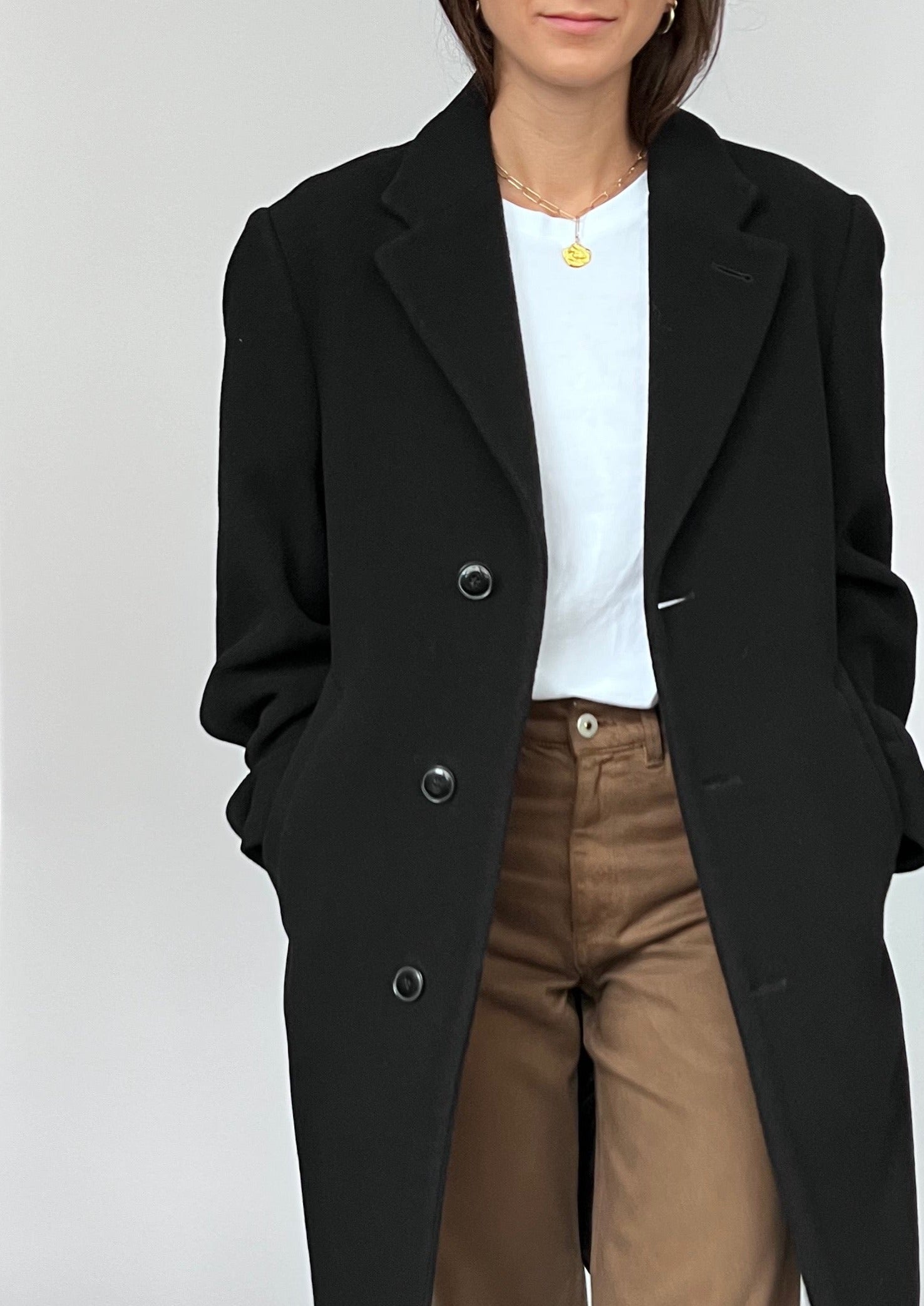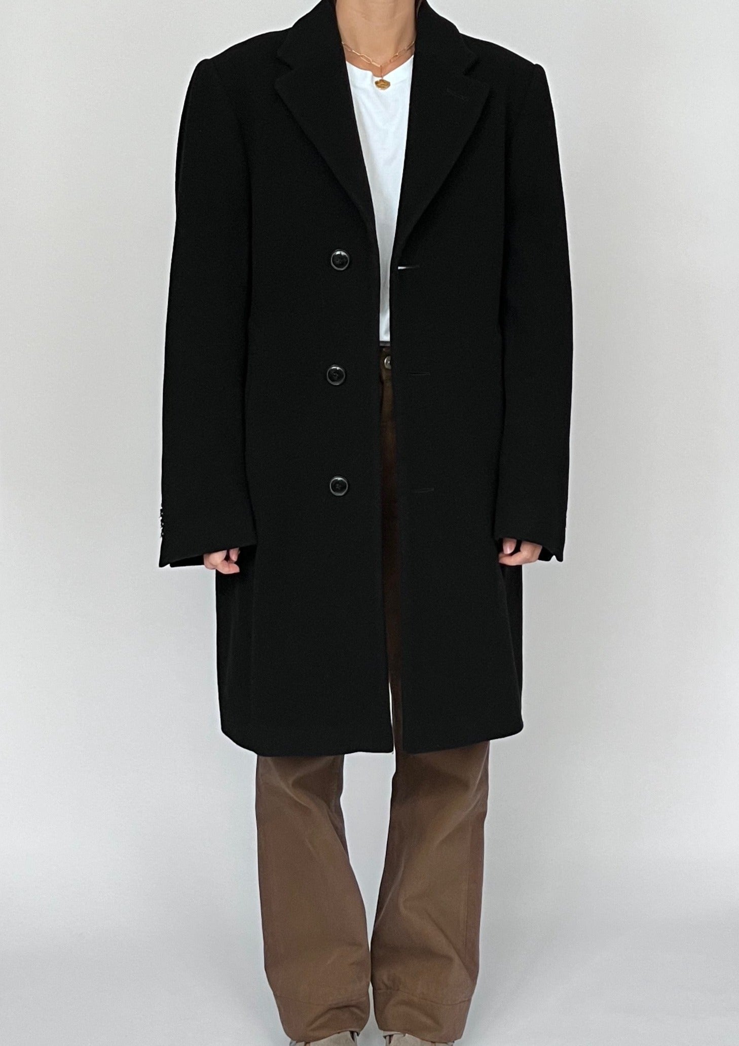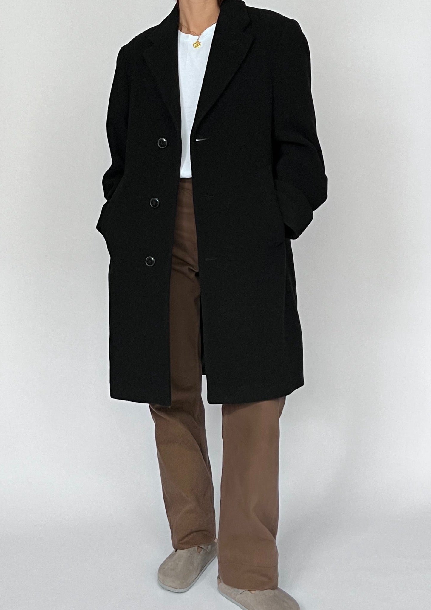90s Classic black shorter length wool coat. Features two side pockets, a button fastening, fully lined and a clean cut. A smarter fit.
